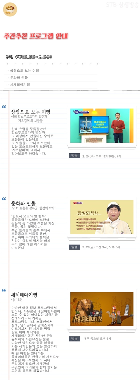 우주 봄과 여름의 선천 우주가 끝나고 가을우주로 들어가는 후천대개벽의 실상을 밝혀주고 극복할 길을 제시하는 증산도 STB 상생방송 2021년 2월 4주차 주간 추천 프로그램은 《상징으로 보는 여행》 <4회 합스부르크가의 발전과 '샤츠캄머'의 보물들>, 《문화와 인물》 <51회 토종콩 광복군, 함정희 박사>, 《세계테마여행》 <총 16편>입니다.