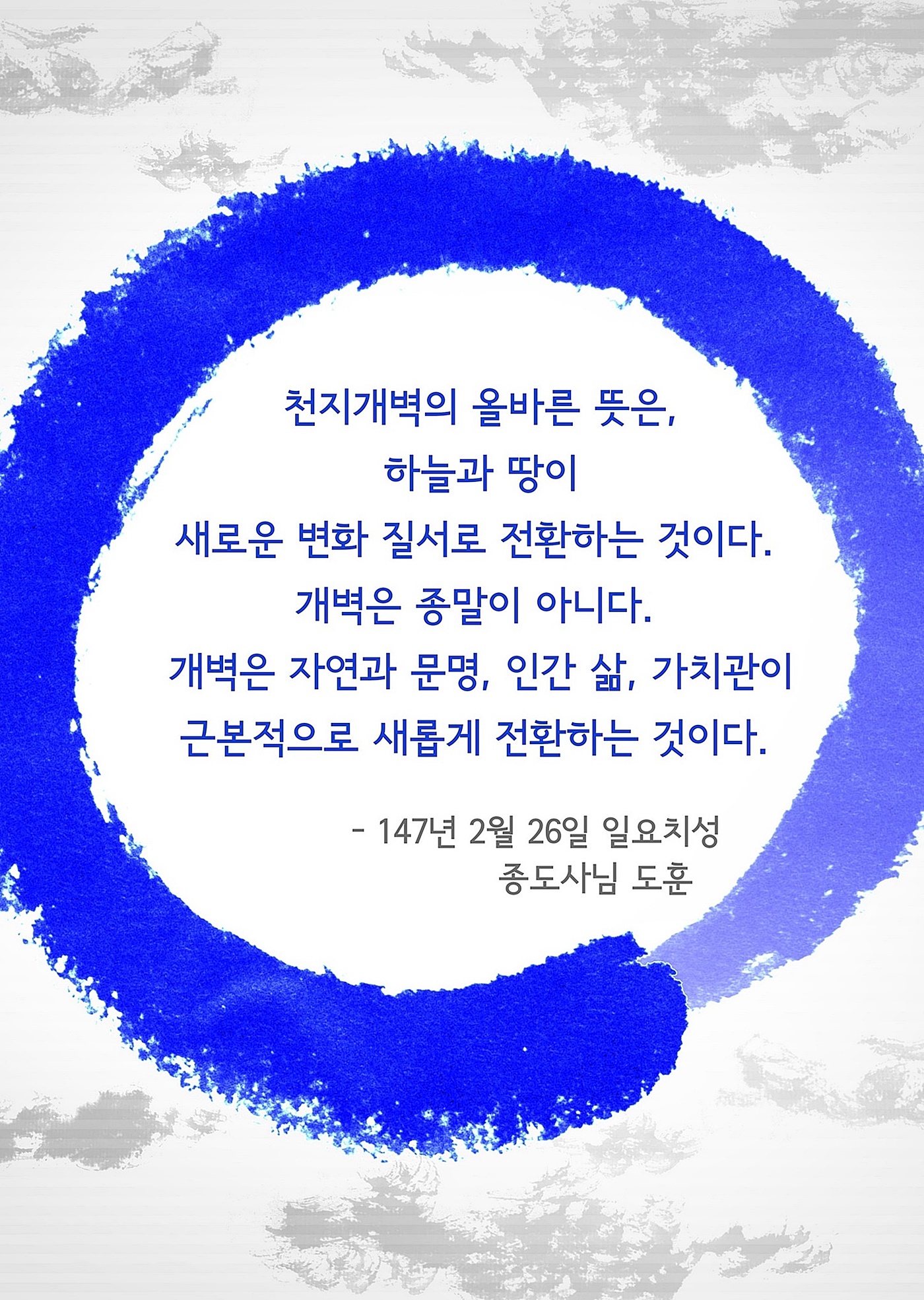 정치, 경제, 사회, 문화, 교육 등 전 분야에서 이제껏 경험해보지 못했던 지구촌 사회질서와 인간 삶의 방식이 근본적으로 바뀌는 문명사적 대전환기에 살고 있습니다. 어머니 하나님이신 태모 고수부님께서는 "선천(先天)에도 개벽이 있고 후천에도 개벽(開闢)이 있나니, 상고지사(上古之事, 옛적 일)를 더듬어 보면 래도지사(來到之事, 다가올 일)를 알고, 다가올 일을 알면 나의 일을 아느니라."라고 말씀하셨습니다.