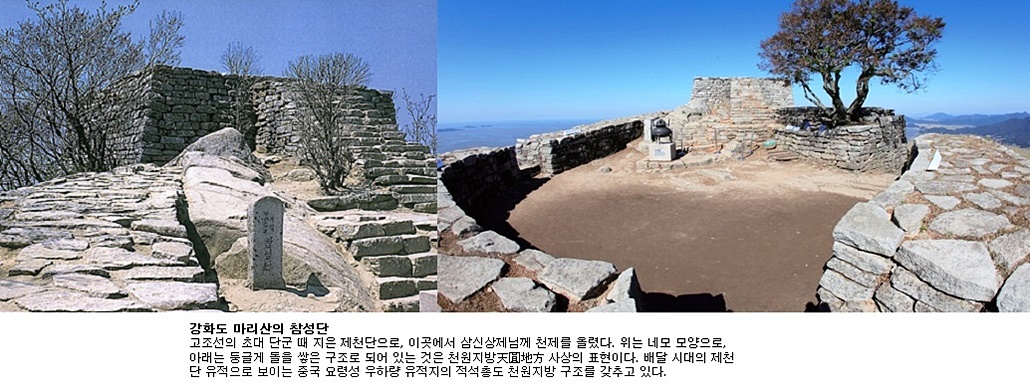 인천광역시 강화군 마리산 정상에는 천원지방(天圓地方) 사상에 근거한 제단(祭壇) 참성단이 있습니다. 강화도 마리산 참성단은 고조선 초대 단군왕검께서 재위 51년 무오년(BCE 2283) 운사 배달을 시켜 축조한 것으로 우리나라에 현존하는 가장 오래된 제천단(祭天壇)입니다.