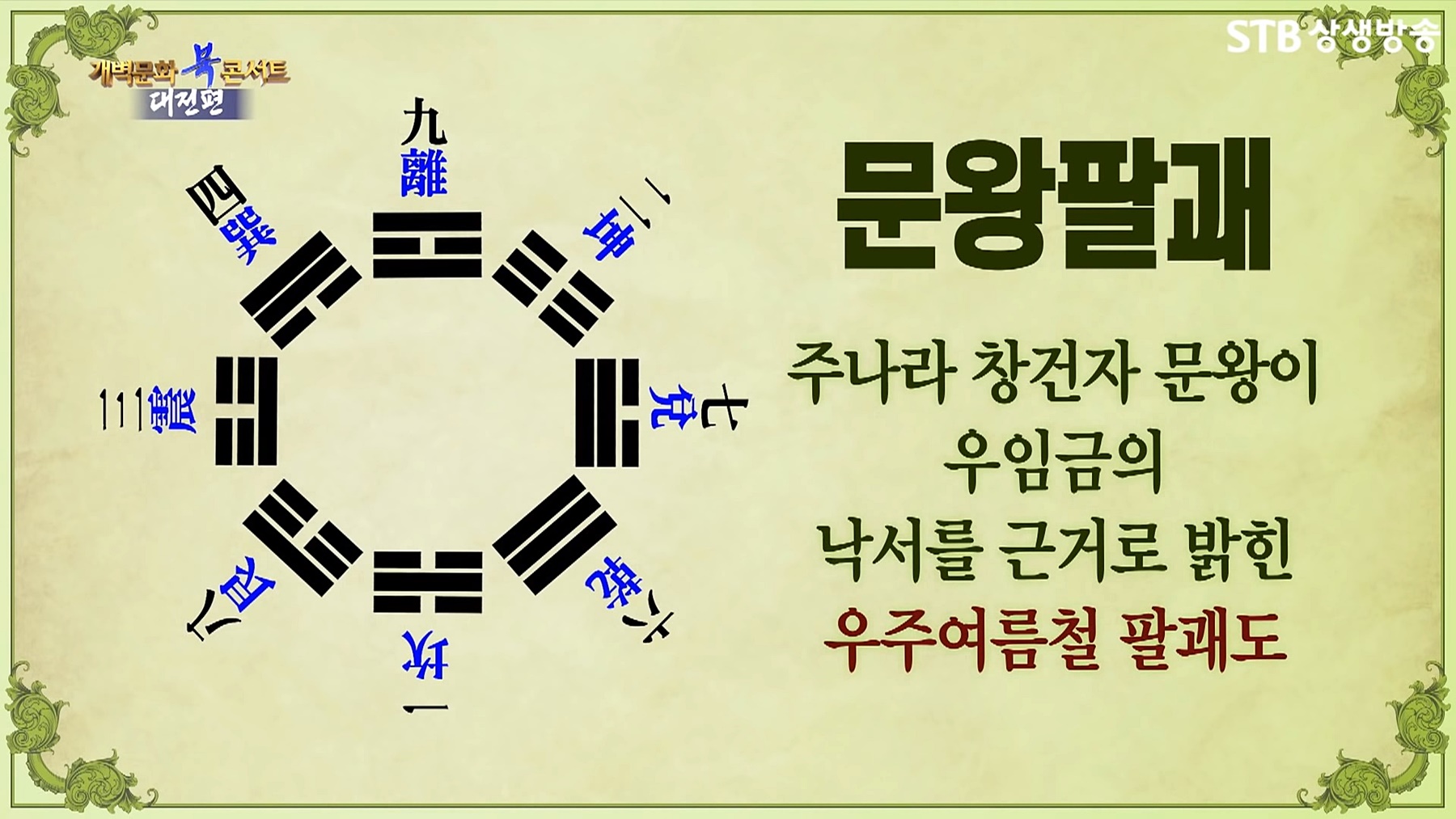 태호복희씨가 천지인(天地人)이 변화하는 이치를 한 장의 그림과 복희팔괘로 세상에 밝혀 놓았습니다. 이후 주나라 문왕이 문왕팔괘와 64괘(팔괘 8×8=64)를, 문왕의 넷째아들 주공(무왕의 동생)이 386효(爻, 64×6=384)를 지으면서 우주 변화의 이치가 주나라 때 정립됐다는 의미로 '주역(周易)'이라는 이름으로 불리게 됩니다.