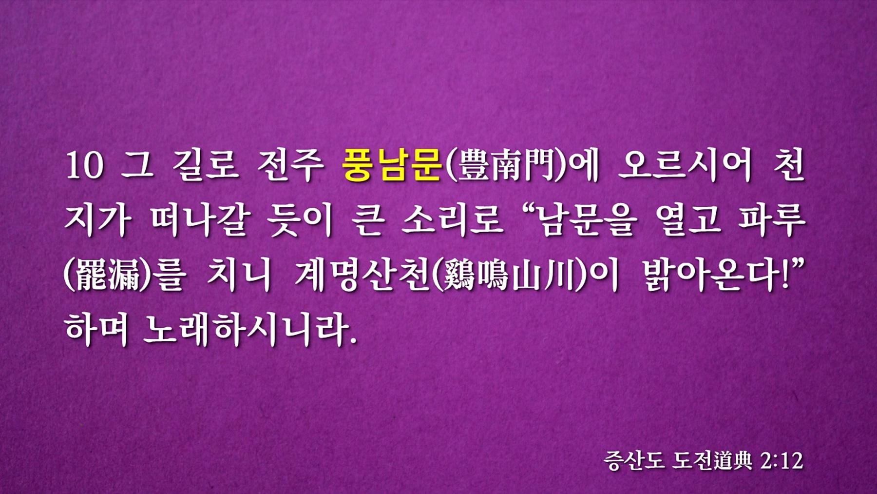 우주의 질서가 상극에서 상생으로 전환하는 가을개벽기를 맞아 가을우주의 새 문화를 열어주시기 위해 인간으로 오신 아버지 하나님 증산상제님께서 하늘과 땅과 인간과 신(神)의 세계를 총체적으로 개벽하는 천지공사(天地公事)의 출발점이 전주 풍남문이며 천지공사의 결론도 '풍남문(豊南門)'의 깊은 의미 속에 다 담겨 있습니다.
