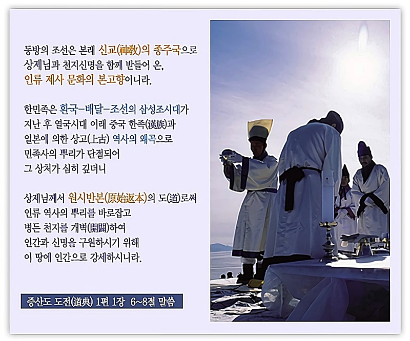 "동방의 조선은 본래 신교(神敎)의 종주국으로 상제님과 천지신명을 함께 받들어 온, 인류 제사 문화의 본고향이니라." (증산도 도전 1:1:6), "세계 대운(大運)이 조선으로 몰라 들어오니 만의 하나라도 때를 놓치지 말라. 이 세상에 조선과 같이 신명 대접을 잘하는 곳이 없으므로 신명(神明)들이 그 은혜를 갚기 위하여 각기 소원을 따라 꺼릴 것 없이 받들어 대접하리니 도인(道人)들은 아무 거리낌 없이 천하사(天下事)만 생각하게 되리라." (증산도 도전道典 2:36:1~4)