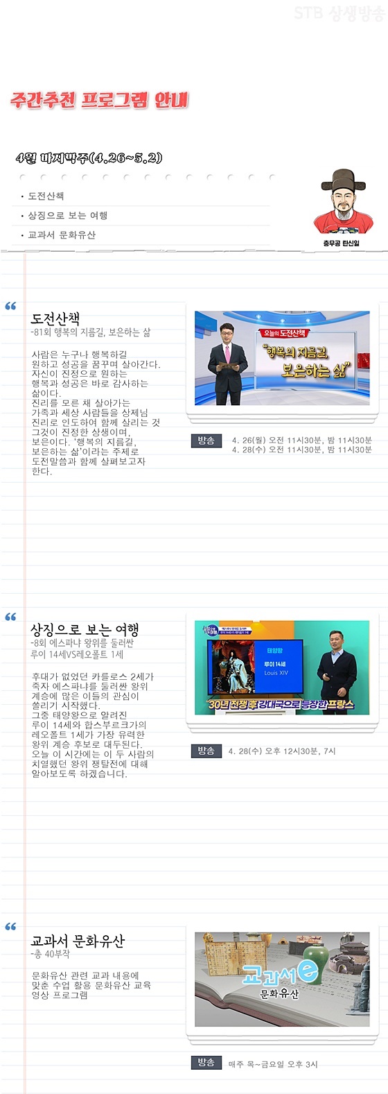 우주의 꿈과 이상을 성취하는 이상적인 인간상 홍익인간의 위대한 삶의 비전을 제시하는 지구촌 유일의 한韓문화 중심채널 STB 상생방송 2021년 4월 5주차 주간 추천 프로그램은 《도전道典 산책》 <81회 행복의 지름길, 보은하는 삶>, 《상징으로 보는 여행》 <8회 에스파냐 왕위를 둘러싼 루이 14세 vs 레오폴트 1세>, 《교과서 문화유산》 <총 40부작>입니다.