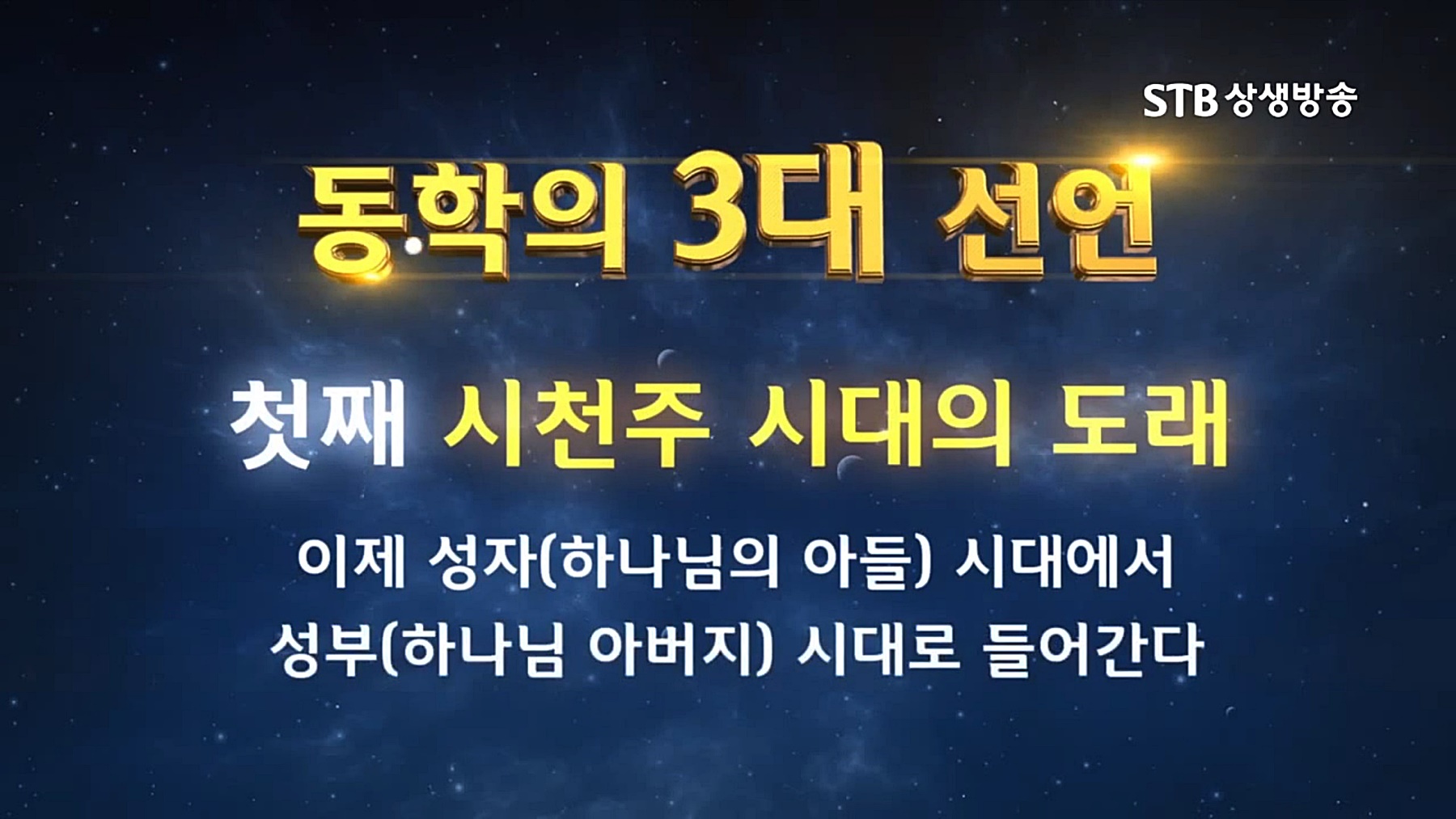동학은 인격적인 하느님이시며 인간으로 강세하시는 아버지 하나님을 모시라는 '시천주(侍天主) 시대'를 선언했습니다. 다시 말해 수운 최제우 대신사는 천지인 삼계 우주를 다스리는 아버지 하나님이신 상제님의 강세를 준비한 것입니다. 그뿐만 아니라 자연 질서가 대전환하면서 새 세상이 열리는 '개벽(開闢)'이 다시 일어난다는 것과 아버지 하나님이신 상제님의 대도(大道) 진리인 무극대도(無極大道)가 출현하여 가을대개벽을 극복하고 후천 5만 년의 무극지운(無極之運)의 세 사상이 열린 것을 예고했습니다.