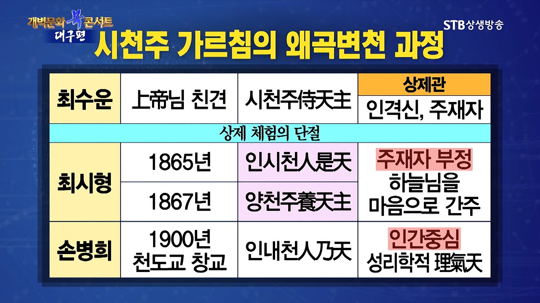 우주 통치자이신 상제님으로부터 직접 천명(天命)과 신교(神敎)를 받은 수운 최제우 대신사의 가르침은 최시형, 손병희 선생으로 이어지면서 본질과 멀어졌습니다. 2대 교주 해월 최시형 선생은 '인시천(人是天)과 '양천주(養天主)'의 사람이 곧 하늘이니 우리 안의 사람을 섬기되 하늘님 섬기듯 해야 한다는 '사인여천(事人如天)'으로 변질됩니다.