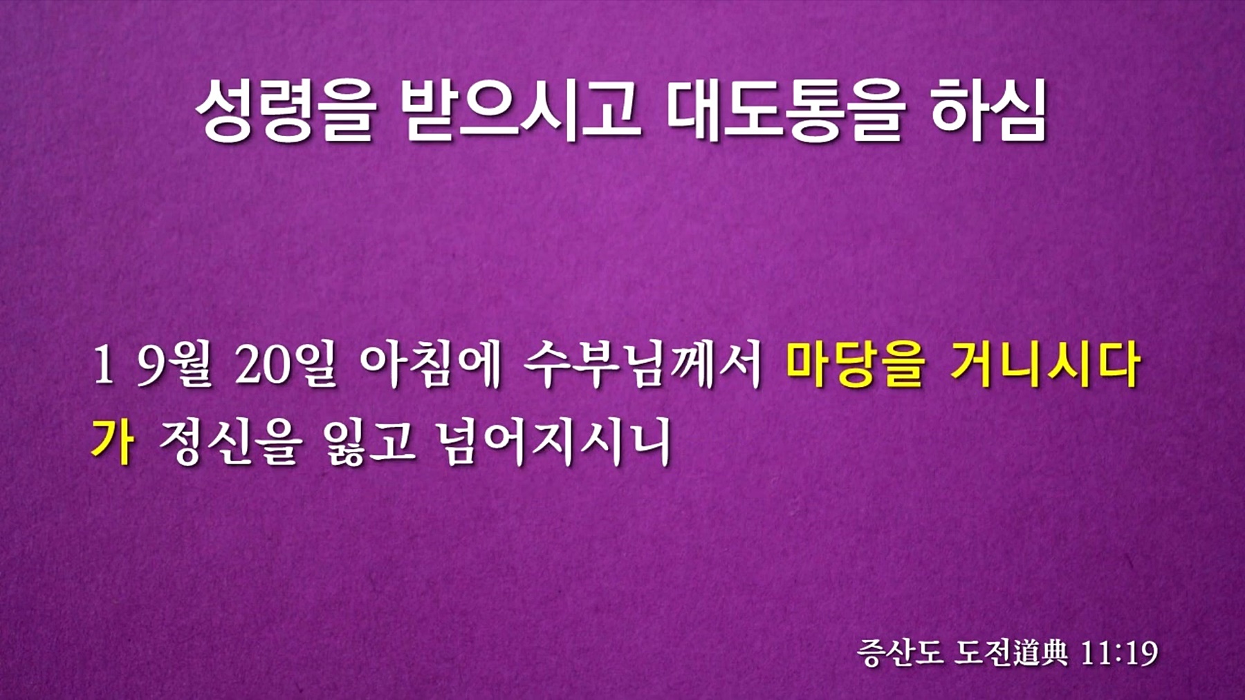 증산 상제님께서 어천(御天) 하신지 2년째 되던 도기(道紀) 41년 음력 9월 19일, 서력 1911년 어머니 하나님이신 태모 고수부님께서는 성도들을 모아놓고 증산 상제님 성탄대치성을 모셨습니다. 그리고 다음 날(9월 20일) 우주 통치자이신 증산 상제님의 조화 성령을 받아 대도통을 하시고 어머니 하나님으로 조화권능을 자유자재로 쓰시기 시작하셨습니다.