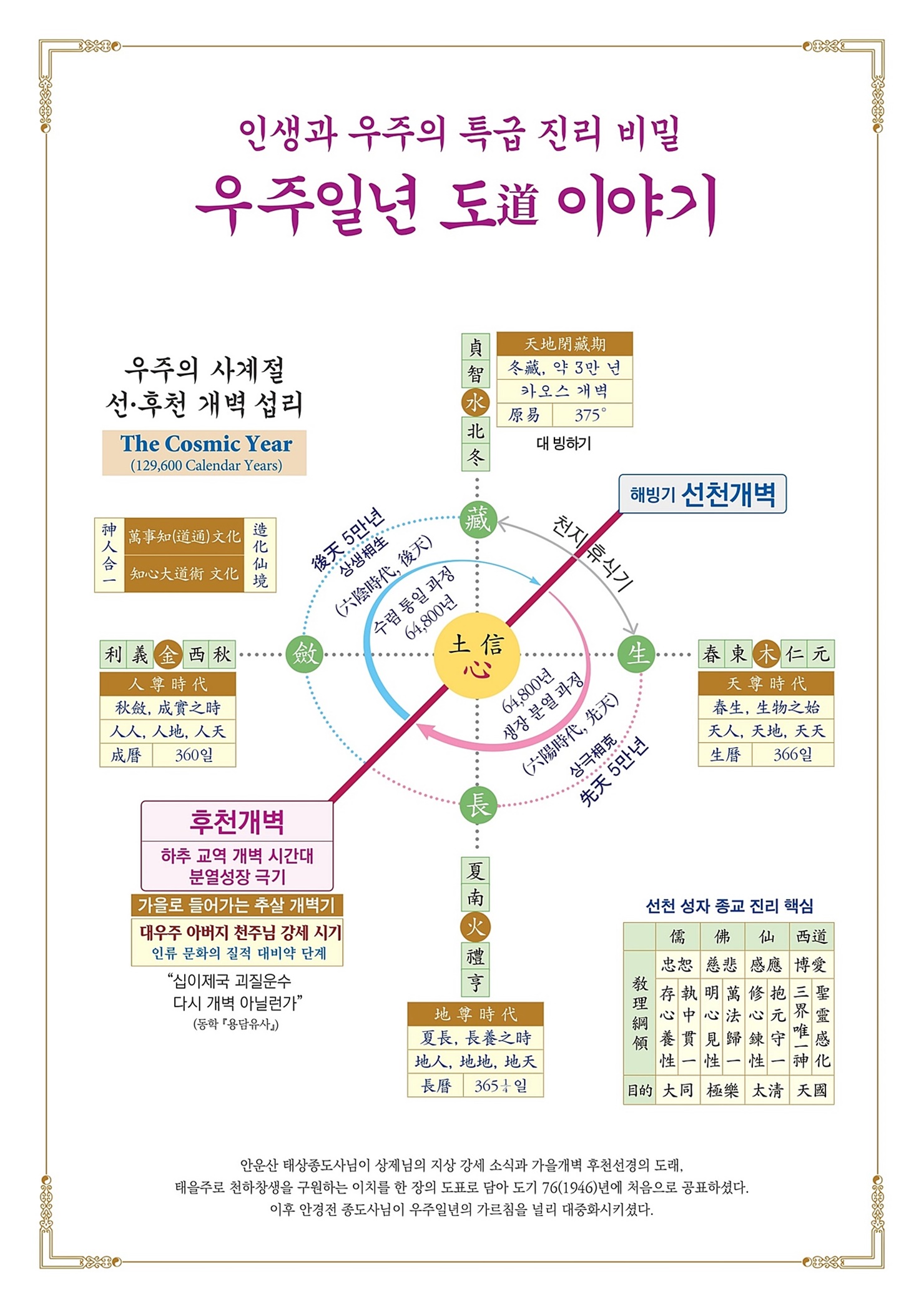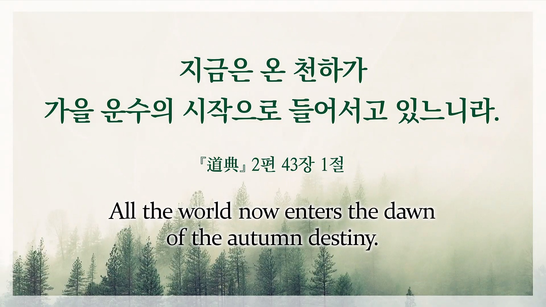 모두가 문명 대전환의 시대라고 말하지만, 천지 대자연의 이치를 모르기 때문에 앞으로 인류가 맞이할 새 문명에 대해서는 구체적인 비전을 제시하지 못합니다. 우주의 질서가 상극에서 상생으로 전환하는 가을개벽기를 맞아 가을의 새 운수를 열어주시기 위해 151년 전 인간으로 강세하신 상제님께서는 "지금은 온 천하가 가을 운수의 시작으로 들어서고 있느니라."라고 말씀하셨습니다.