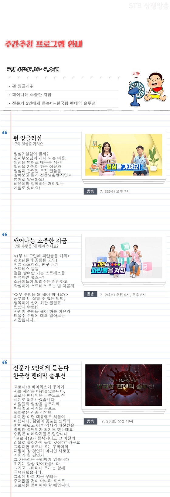 자연개벽과 문명개벽과 인간개벽의 가을대개벽을 건너 새롭게 열리는 후천 5만 년 상생의 새 문화를 열어가는 증산도 STB 상생방송 2021년 7월 4주차 주간 추천 프로그램은 《펀 잉글리쉬》 <7회 일심(一心)을 가져요>, 《깨어나는 소중한 지금》 <7회 수행을 왜 해야 하나요?>, 《전문가 5인에게 듣는다》 <한국형 팬데믹 솔루션>입니다.
