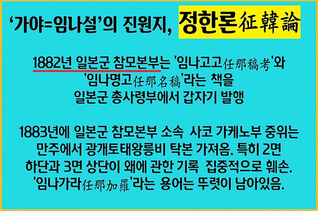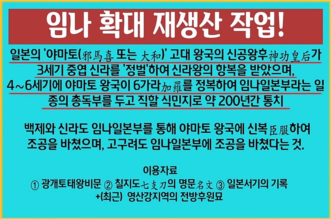 <일본서기>에는 야마토 왜(일본)가 고구려, 백제, 신라를 식민지로 삼았고, 심지어 고구려의 광개토태왕까지 조공을 받쳤다는 개가 웃을 내용이 있습니다. 경성제국대에서 식민사학 후예들을 양성하고 조선총독부 조선사편수회에서 한국사 왜곡 조작에 앞장선 스에마쓰 야스카즈는 아유카이 후사노신의 말도 안 되는 역사 조작 논리를 그대로 받아들여 '임나흥망사'에서 경상도와 전라도 충청도까지 임나의 식민지였다고 주장했습니다.