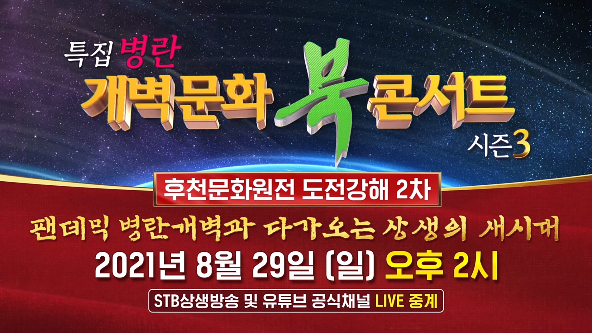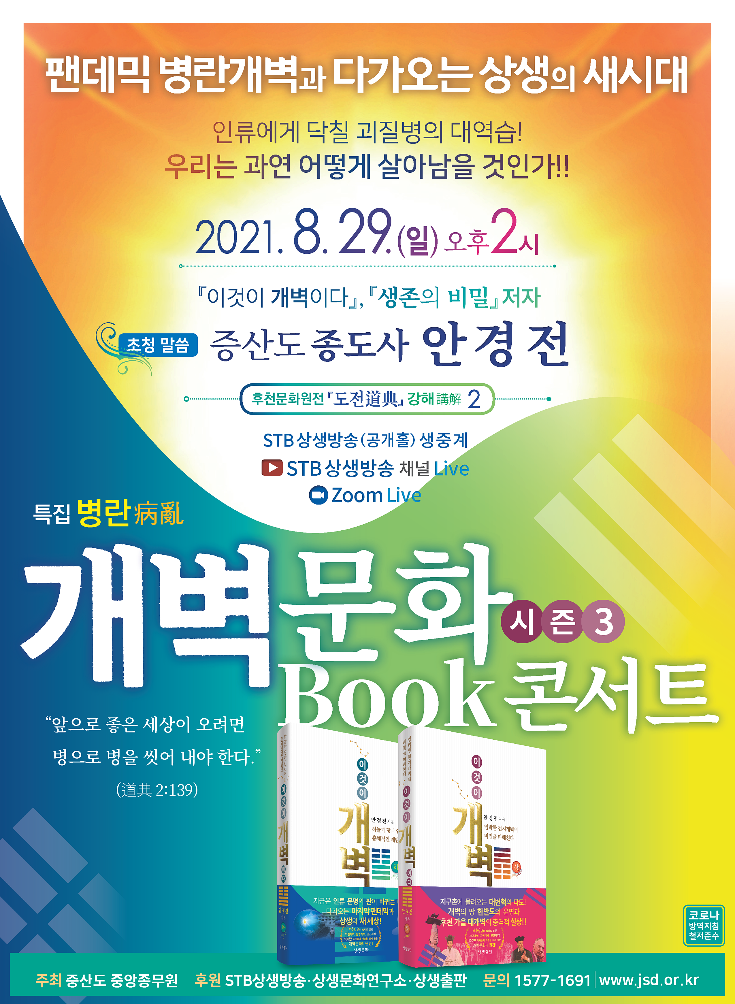 앞으로 자연개벽과 문명개벽과 인간개벽이 한데 어우러지면서 지금과는 비교할 수 없는 전대미문의 마지막 팬데믹이 지구촌을 엄습하게 됩니다. 후천대개벽의 상황에서 우리는 어떤 선택을 해야 하고, 그 생존의 길은 무엇인지 <특집 병란病亂 개벽문화 북콘서트 시즌3 - 팬데믹 병란개벽의 대세와 다가오는 상생의 새 시대> 강연을 통해 우주적 인간으로 다시 태어나는 소중한 시간이 되시기를 기원합니다.