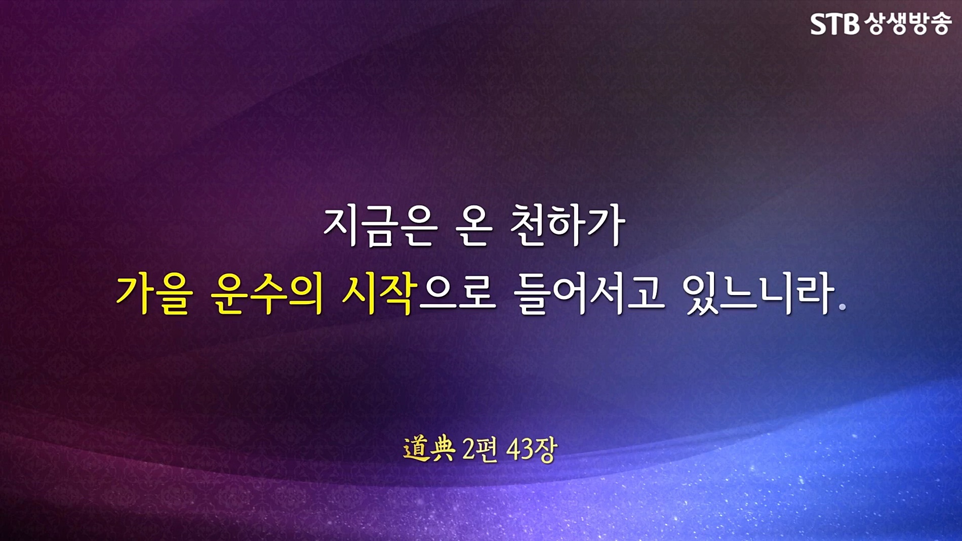 지금은 여름이 서서히 끝나가면서 가을로 들어가는 환절기입니다. 인간이 초목농사를 짓는 지구 1년의 사계절 변화와 마찬가지로 대우주가 사람농사를 짓는 129,600년의 우주 1년 사계절이 있습니다. 오늘의 인류가 살고 있는 지금 이 시대는 여름우주가 끝나가는 시점입니다. 다시 말해 지구촌 인류는 가을우주로 서서히 들어가고 있습니다.
