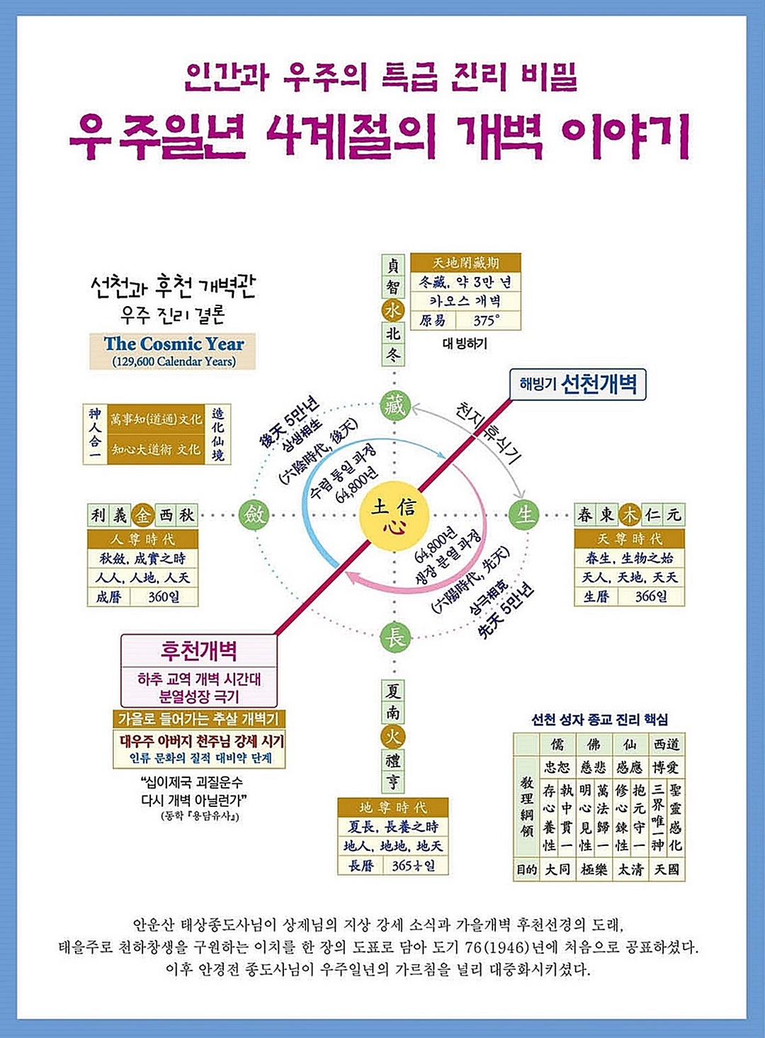 인류는 지금 대우주가 사람농사를 짓는 여름철 말에서 가을우주로 들어서는 가을개벽기, 상극 질서의 봄과 여름우주가 끝나고 상생 질서로 돌아가는 가을우주로 들어가는 우주적 대격변기에 살고 있습니다. 지구촌 인류는 싫든 좋든 상관없이 모두 가을우주로 넘어가야 합니다. 지금은 대우주의 계절이 바뀌는 가을대개벽기이므로 그 어느 때보다 천지 대자연에 대한 인식과 천지대세의 틀을 바르게 보는 안목이 필요합니다.