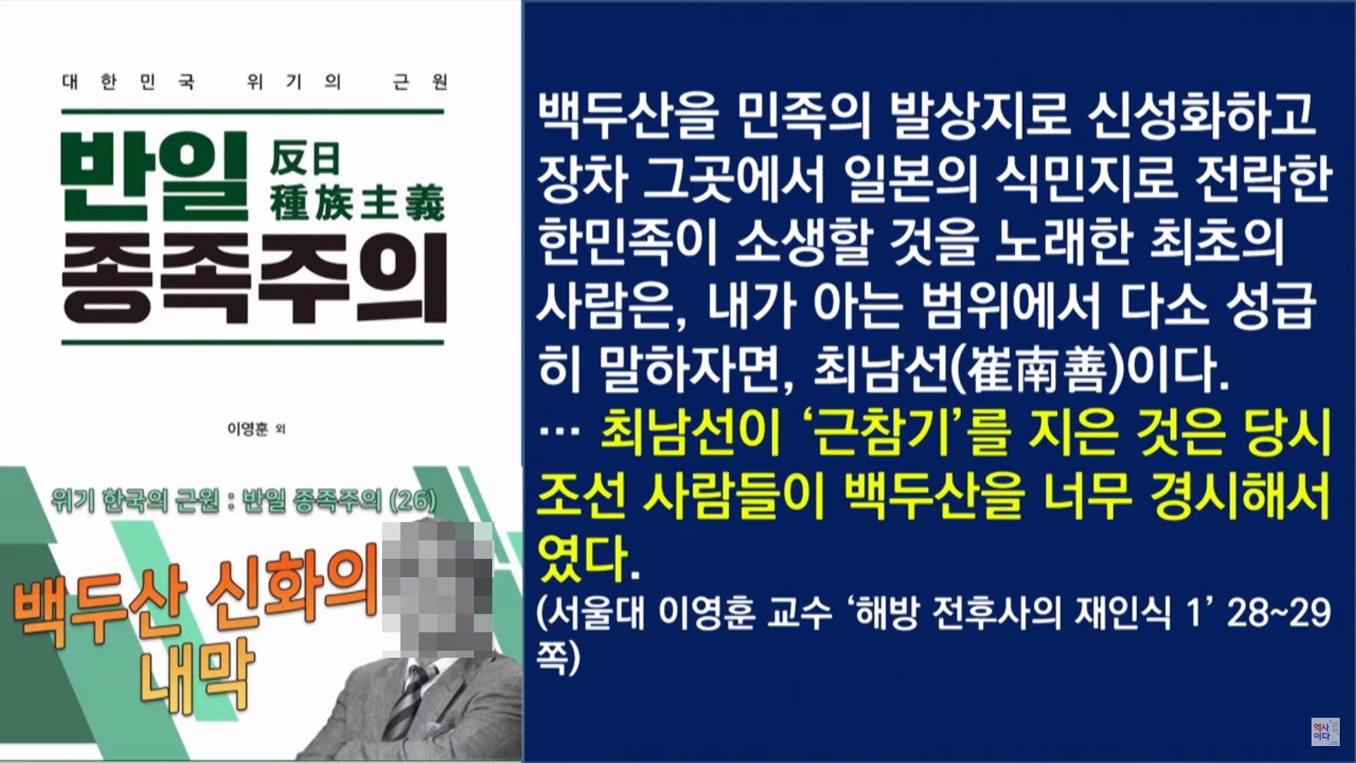 '반일 종족주의'의 공동집필자 이영훈은 2006년 박지향, 김철 등과 함께 '해방 전후사의 재인식'이라는 책을 썼습니다. 이영훈은 '해방 전후사의 재인식'에서 "백두산을 민족의 발상지로 신성화하고 장차 그곳에서 일본의 식민지로 전락한 한민족이 소생할 것을 노래한 최초의 사람은, 내가 아는 범위에서 다소 성급히 말하자면 최남선이다.... 최남선이 '근참기'를 지은 것은 당시 조선 사람들이 백두산을 너무 경시해서였다."라고 주장했습니다.