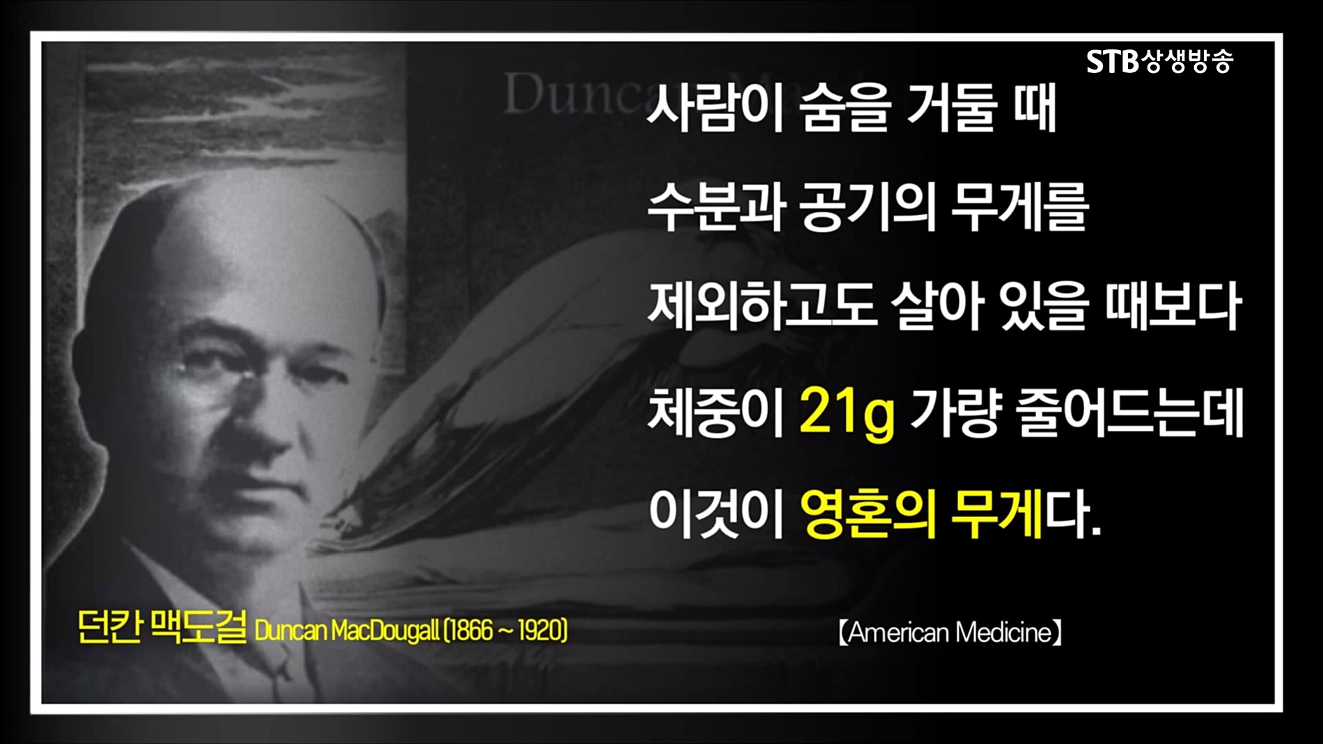 과학이 발전하면서 인간의 호기심은 우주의 신비와 외계인의 존재, 영생, 영혼의 세계와 귀신의 실체 등 미스테리하고 미지의 영역까지 파고들기 시작했습니다. 1907년 뉴욕타임스와 미국 의학학회지에 던컨 맥두걸 박사는 인간의 영혼도 물질이라는 가정하에 사망 직전 6명의 몸무게가 사망하는 순간 수분과 공기 무게를 제외하고 약 21g이 갑자기 줄었다는 연구 결과를 발표했고, 2007년 스웨덴의 룬데 박사도 사망 직후의 체중 변화가 약 21g이었다는 사실을 발표했습니다.