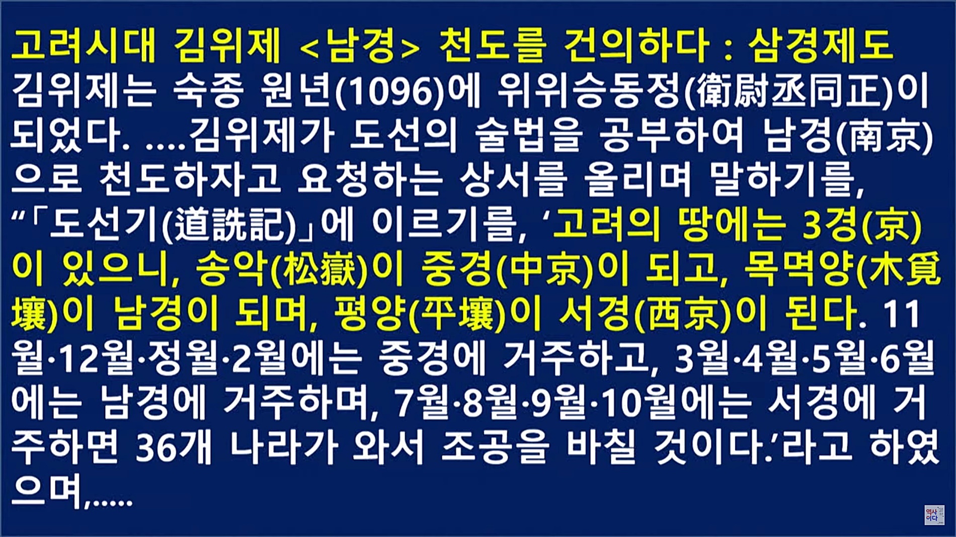 김위제는 남경(한양 서울) 천도를 주장할 때 신라 말 도선국사가 썼다는 지리도참서 <도선기道詵記>와 <답산가踏山歌>, 단군조선의 6대 구물 단군 때 신지 발리가 지어 올린 <신지비사> 내용을 구체적으로 언급하면서 삼경 제도의 필요성을 역설합니다. 김위제가 주장한 고려의 삼경 제도는 임금께서 고려의 수도인 중경(개경, 송악)과 서경(평양)과 남경(한양 서울)을 4개월씩 순회, 거주하면서 국가를 다스리기를 건의한 것입니다.