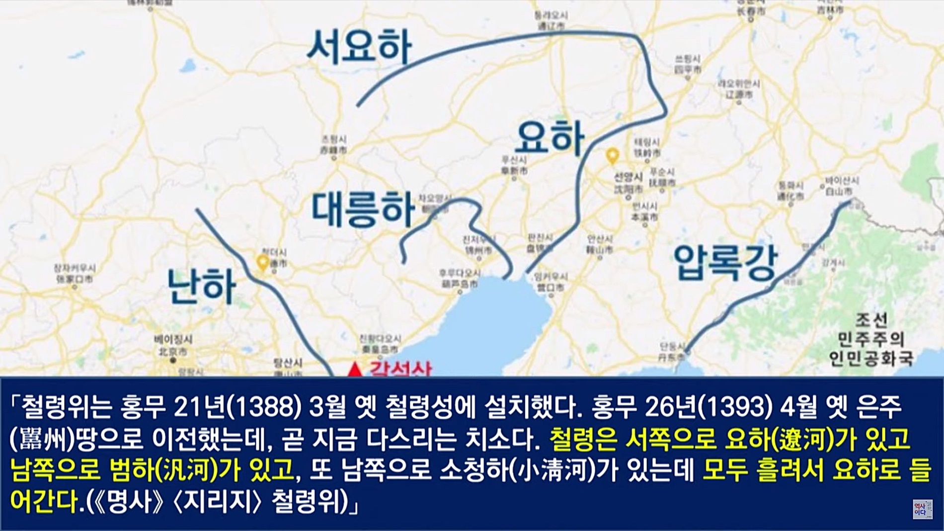 원나라(몽고)의 역사책인 <원사>는 "(1273)요동의 쌍성(총관부) 및 화주 등처에서도 금을 캐게 했다."라고 기록하고 있습니다. 명나라 역사책인 <명사>에도 "홍치 16년(1503) 3월 경오에 요동 철령위에 북두성 같은 불이 떨어졌다."라는 기록과 <원사>의 기록은 모두 '쌍성총관부와 철령위의 위치가 요동'이라고 말하고 있습니다.