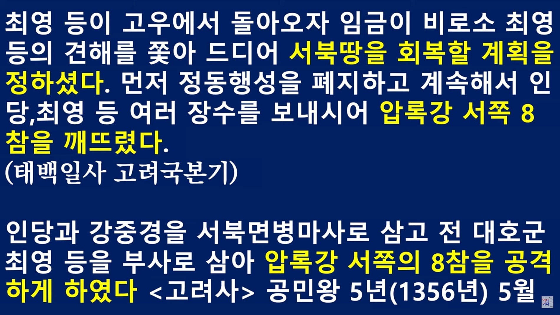 <고려사>에는 공민왕의 명을 받들어 강중경, 신순, 유홍, 최영 등은 압록강을 서쪽을 공격하여 고려의 서북쪽 국경선(서북계)을 위치를 확장했고, 유인우, 공천보, 김원봉 등은 쌍성총관부를 수복하여 고려 동북쪽 국경선(동계) 위치를 확장했다고 기록했습니다. 우리가 배우는 쌍성총관부의 위치는 동계(東界)와 전혀 다른 함경남도 영흥입니다.