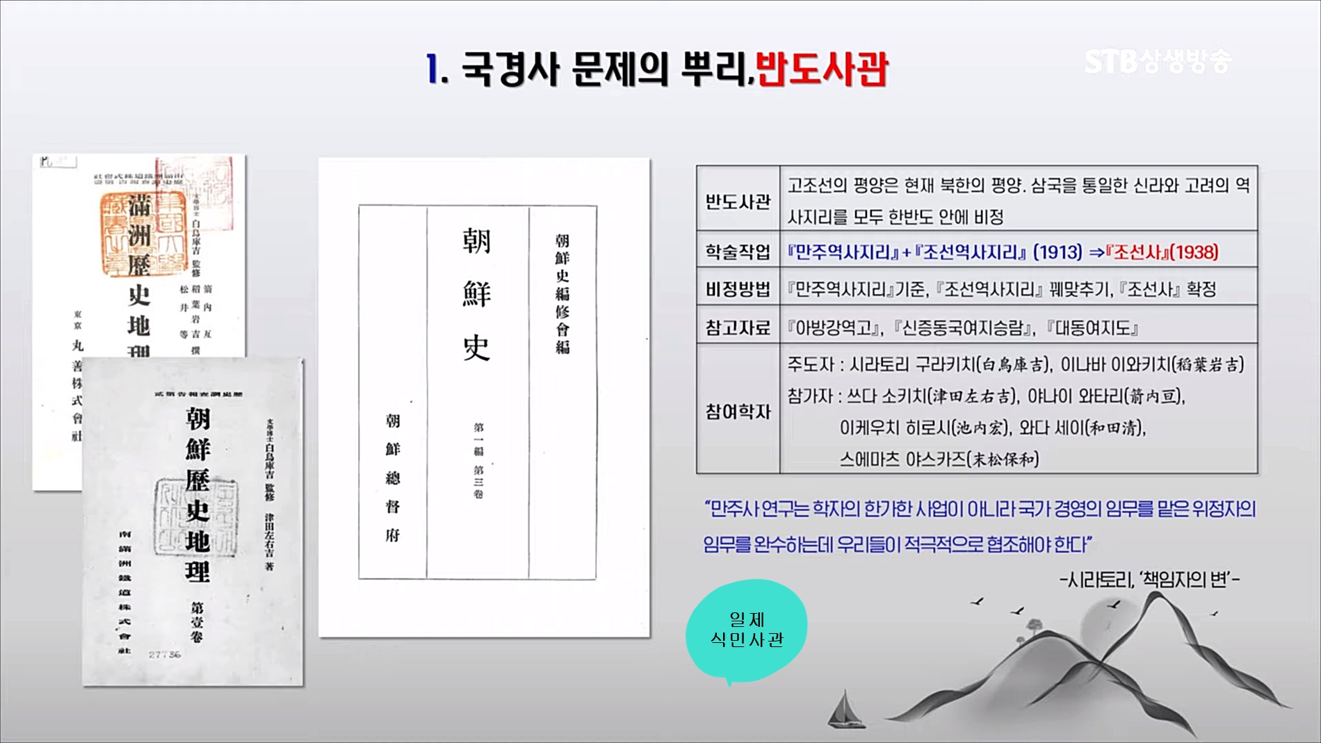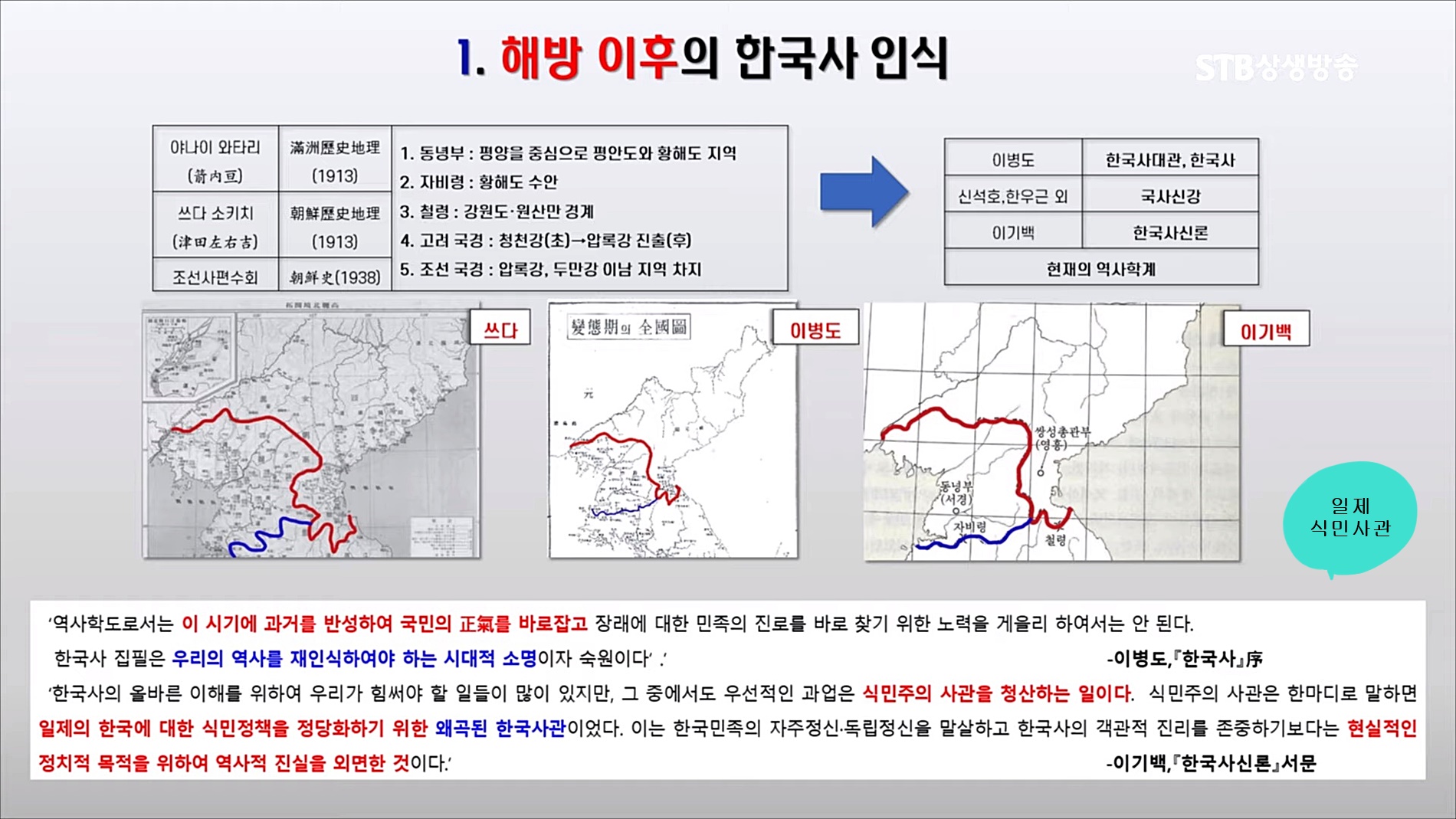 조선을 침략과 식민지배를 정당화하기 위해 일본 왕 명치를 필두로 일제의 민관군(民官軍)이 혼연일체가 되어 한국의 역사와 정신문화의 뿌리를 잘라내고 왜곡 조작된 역사관을 일제 식민사관이라고 합니다. 조선은 옛날부터 스스로 변화를 이루지 못하고 항상 남의 힘으로 발전했고, 한반도를 벗어나지 못하고 허구한 날 싸움질만 하다 망한 민족이라는 소위 '타율성론'과 '정체성론'과 '반도성론'과 '당파성론'은 악질적이고 불의한 일제 식민사관입니다.