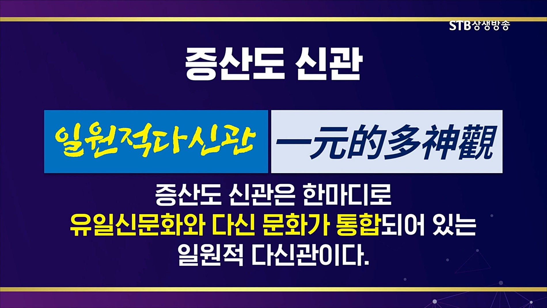 하늘과 땅과 인간이 총체적으로 대개벽 하는 가을개벽의 때를 맞아 가을우주의 새 세상을 열어주시기 위해 인간으로 강세한 우주의 통치자이신 증산 상제님께서 인류 문명사에서 처음으로 신(神)에 대한 근원적이면서 종합적인 가르침을 내려주셨습니다. 증산 상제님의 가르침은 동서양의 유일신론과 범신론 문화가 통합된 일원적 다신론의 신관입니다.