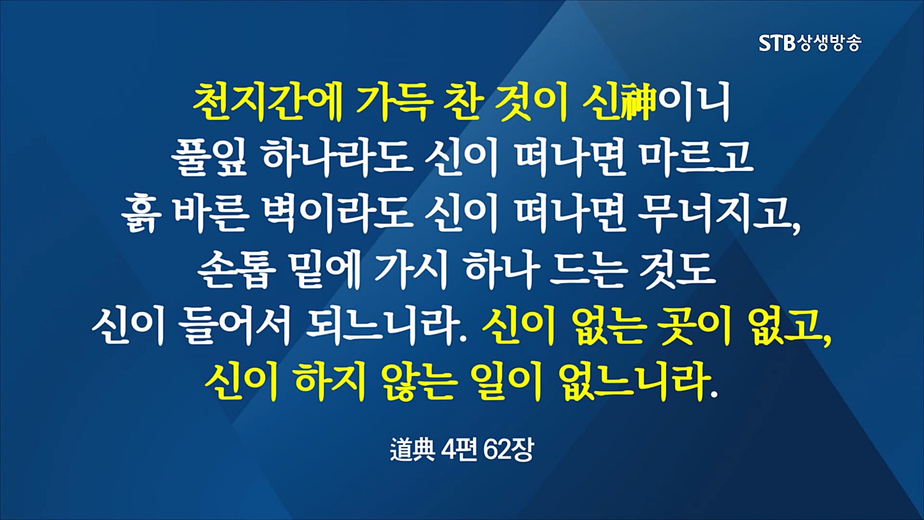 "천지간에 가득 찬 것이 신(神)이니 풀잎 하나라도 신(神)이 떠나면 마르고 흙 바른 벽이라도 신(神)이 떠나면 무너지고, 손톱 밑에 가시 하나 드는 것도 신(神)이 들어서 되느니라. 신(神)이 없는 곳이 없고, 신(神)이 하지 않는 일이 없느니라."라는 증산 상제님의 말씀은 신(神)은 천지만물에 깃들어 존재하고 세상의 만사는 신(神)의 조화로 이루어진다는 말씀입니다.