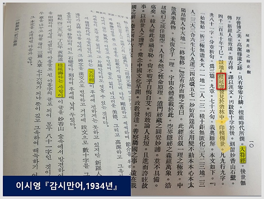 독립운동가이며 초대 부통령을 역임한 이시영 선생은 대일항쟁기 중국인 황영배가 일본 유학 중에 알게 된 식민사관을 영향을 받아 한국사를 왜곡해서 쓴 <조선>이란 책 내용을 보고 1934년 <감시만어感時漫語>를 통해 단군왕검의 고조선 역사와 강역을 명백하게 밝혔고, <환단고기>를 발간한 계연수 선생이 <천부경>을 전문을 인용해 식민사관에 물든 황영배의 잘못된 한국사를 지적했습니다.