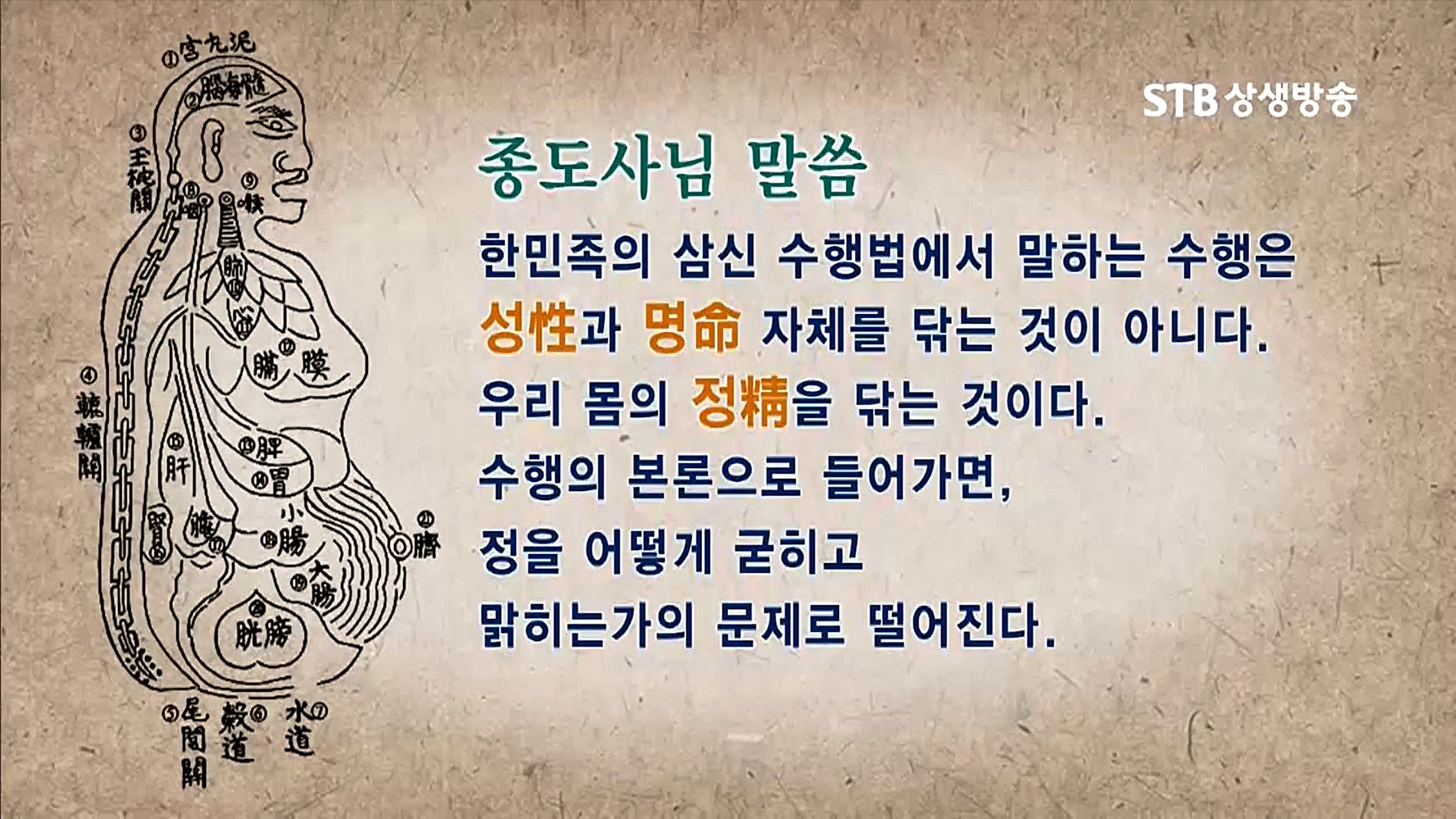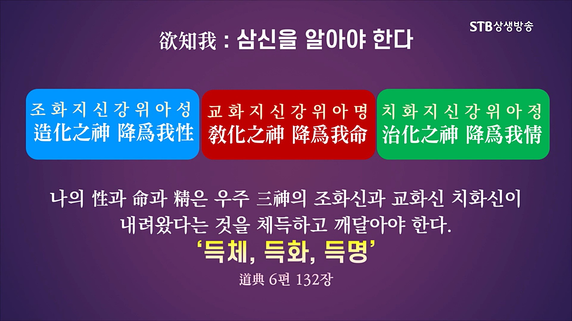 도가(道家)에서는 단학 쪽으로 흘러오면서 이것을 정기신(精氣神)으로 말한다. 우리 한국인의 환국(桓國), 배달국(倍達國), 조선(朝鮮)의 9천 년 수행문화에서 볼 때 진리 원형, 수행법의 원형은 성명정(性命精)이다. 우리는 가을개벽의 모든 병란(病亂)을 꺾는 천지조화 태을주 공부를 해야 한다."