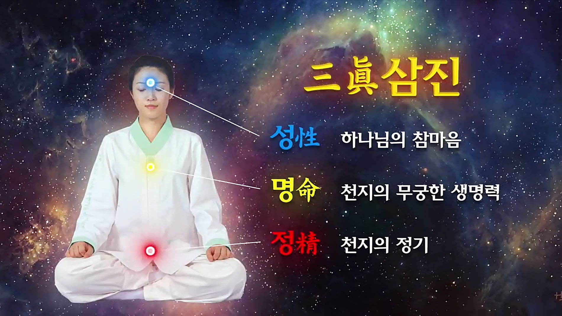 인간이 우주의 조물주 삼신의 본래 마음, 즉 인간의 원래 마음을 찾는 것은 성명정(性命精)에서 정(精)이 근본입니다. 즉 정기 관리가 되지 않으면 절대 온전한 생명의 인간이 될 수 없습니다. 우주 조물주 삼신의 3가지 신성이 내 몸에 들어와 있는 정(精)과 신(神, 성性)을 명화(明化)할 때 본래의 우주 생명력을 회복하여 영원한 생명(命)으로 다시 태어나는 것이 수행의 궁극 목적입니다.