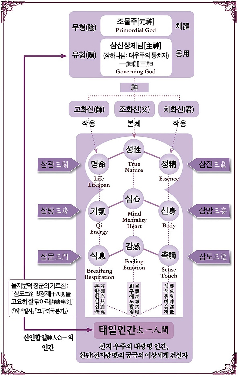 "인간 몸속에는 우주 조물주, 우주의 창조주 신성(神性)이 그대로 들어 있다. 그 3가지 신성이 머리 중심에, 가슴 중심에, 그리고 하단전 쪽에 성명정(性命精)으로 들어와 있다. 조물주의 창조하는 마음을 조화신(造化神)이라 하고, 그 신성을 성(性)이라 한다. 이 성(性)은 우주 조물주의 조화의 마음이다.