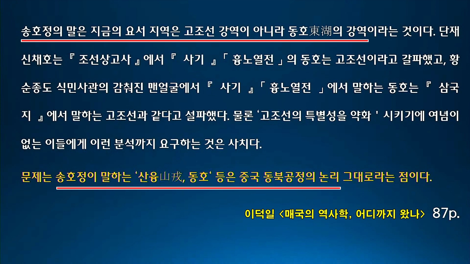 2004년 중국이 역사 왜곡 프로젝트인 동북공정을 한창 진행할 때 송호정은 모 언론과 인터뷰에서 '만약 발해에 이어 고구려까지 중국사로 편입된다면, 다음은 고조선, 고려까지도 위태로워질 것입니다.'라고 말했습니다. 언듯보면 송호정이 마치 우리 역사를 빼앗기지 말아야 한다는 듯한 말인 것처럼 보이지만, 송호정뿐만 아니라 한국 역사학계는 중국의 동북공정에 적극적으로 대응하지 않았습니다.