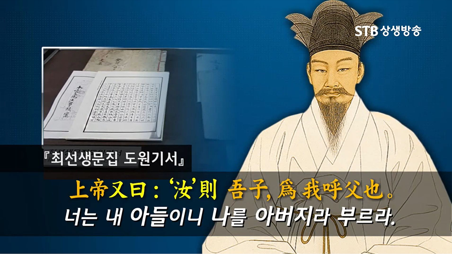 대우주의 존재 근원과 하늘과 땅과 인간의 변화 이치와 목적까지 밝힌 <천부경>을 세상 사람들에게 전해준 고운 최치원 선생의 25대손이 최수운 대성사입니다. 우주의 통치자 상제님께서 천지를 감동하게 하는 수운 최제우 대성사의 지극한 정성을 보시고 천명(天命)과 신교(神敎), 그리고 성부 아버지 하나님을 참되게 모시는 시천주(侍天主) 주문을 내려주었습니다. 수운 최제우 대신사는 높고 크신 상제님의 은혜를 받고 동학(東學)을 창도했습니다.