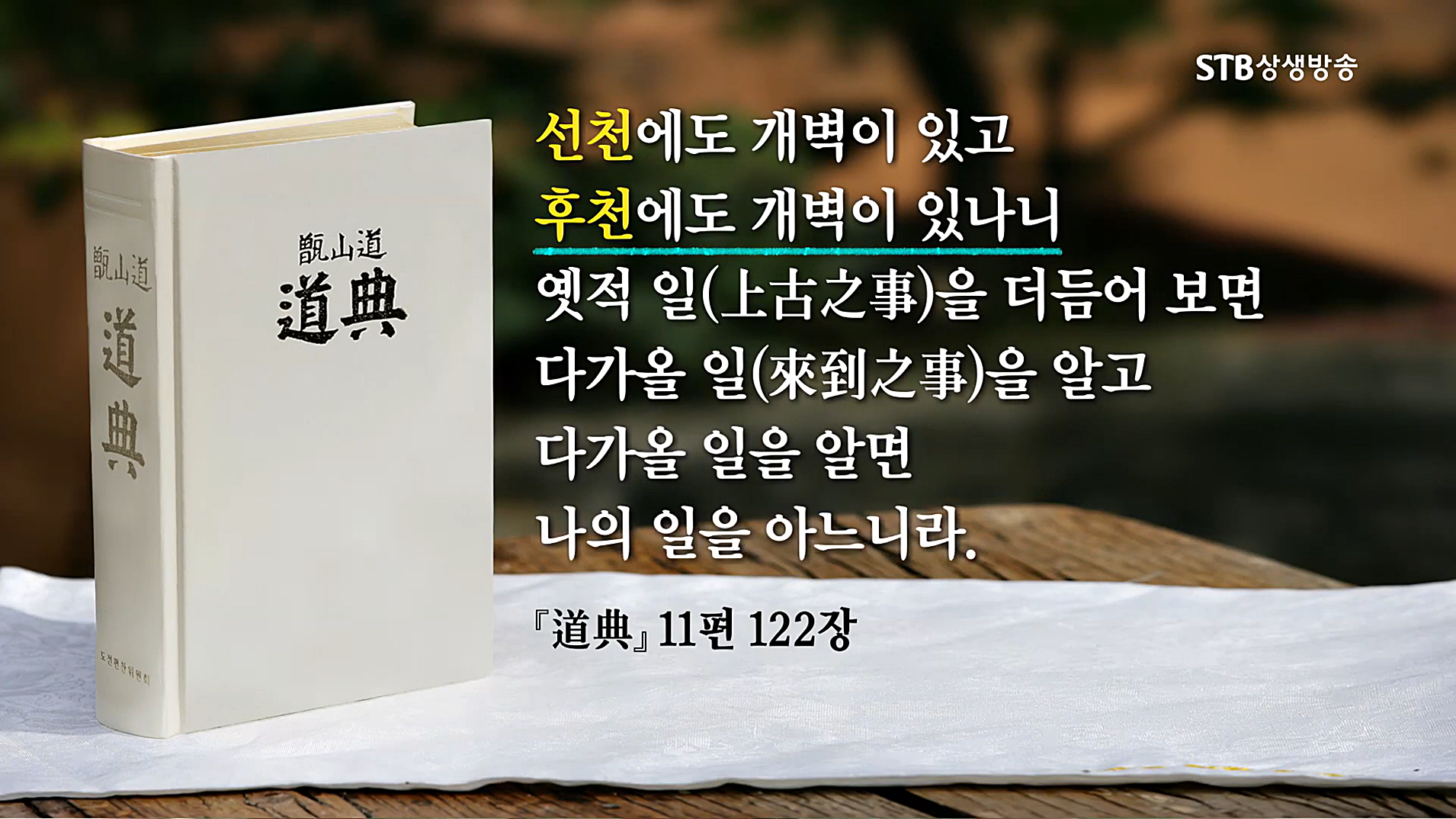 자연개벽은 우주의 질서가 상극에서 상생으로 대전환하면서 우주 환경이 완전히 바뀌는 것입니다. 문명개벽과 인간개벽은 인간이 우주 역사의 주체가 되어 성숙한 문명을 열어나가는 것입니다. 후천대개벽의 상황을 극복한 사람들이 후천 선(仙) 문화를 바탕으로 신인합일(神人合一)의 만사지(萬事知) 문화를 일구어 인간이 우주 역사를 경영하는 우주일가(宇宙一家) 새 문명을 열어나갑니다.