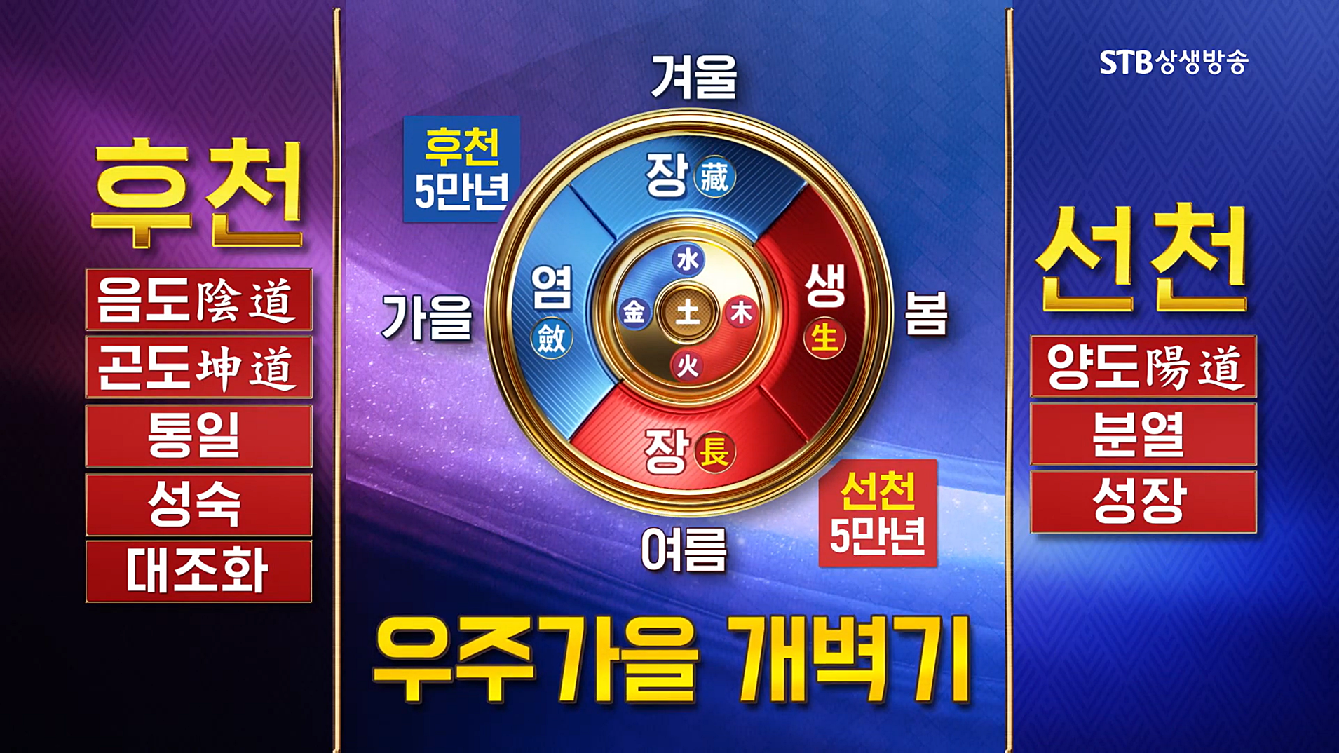 낳고 기르고 결실하고 휴식하는 생장염장 순환 질서의 대자연 이치를 인류 문명사로 보면 현생 인류의 조상이 탄생하는 선천개벽으로 우주의 봄철이 시작되고, 우주의 여름철 동안 인류 문명을 발전시킵니다. 우주 1년의 과장에서 보면 봄과 여름은 전반기 과정이고, 우주 1년에서 가장 큰 전환점인 후천개벽을 거쳐 온전한 인간이 성숙한 통일문명이 열리는 가을우주 시대는 후반기 과정입니다.