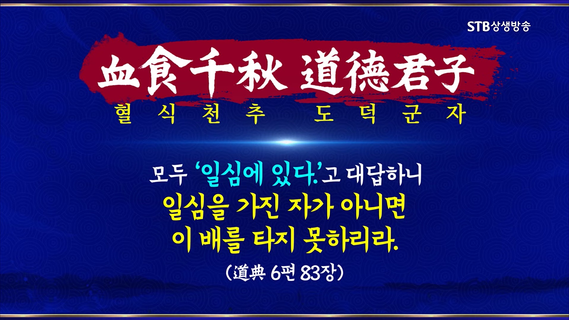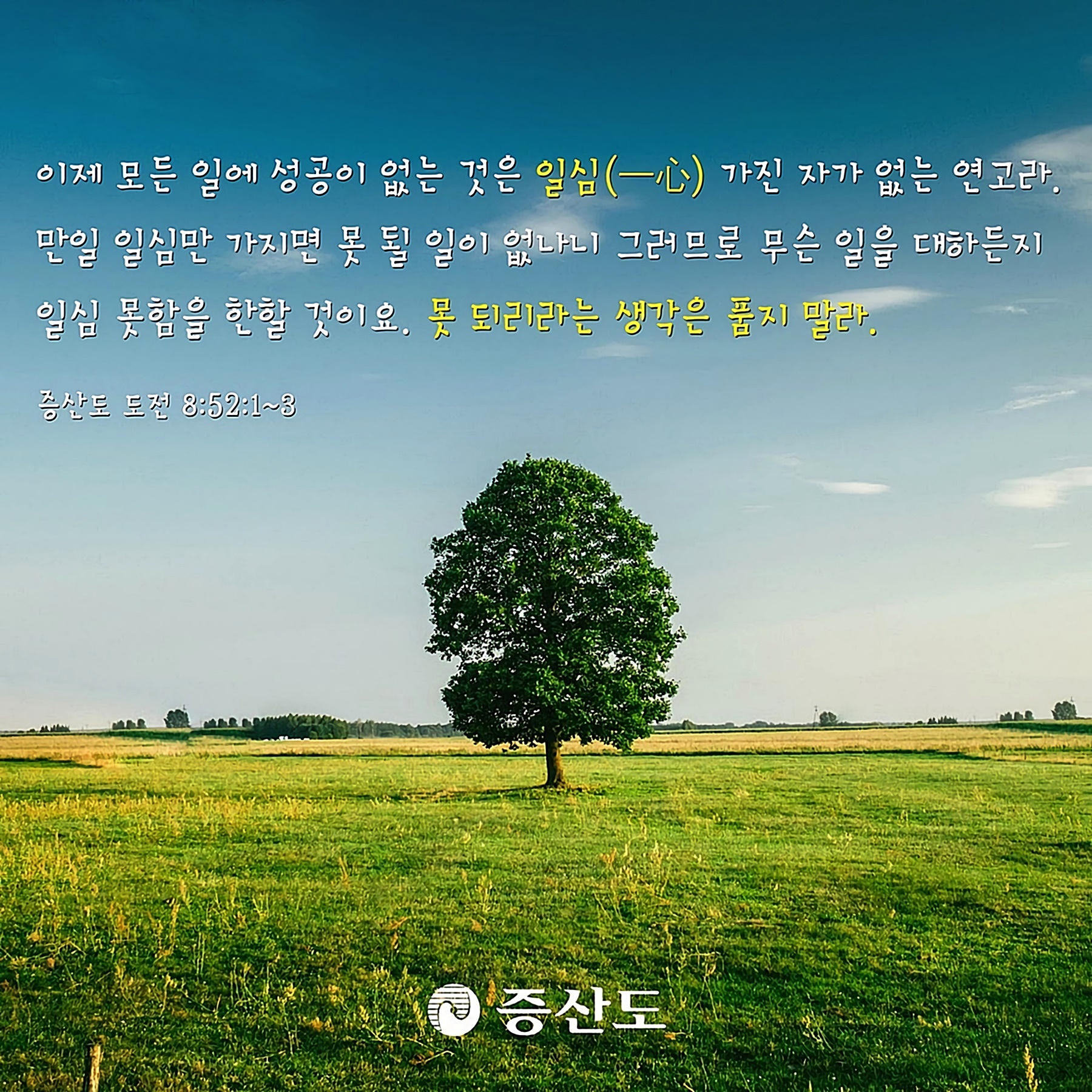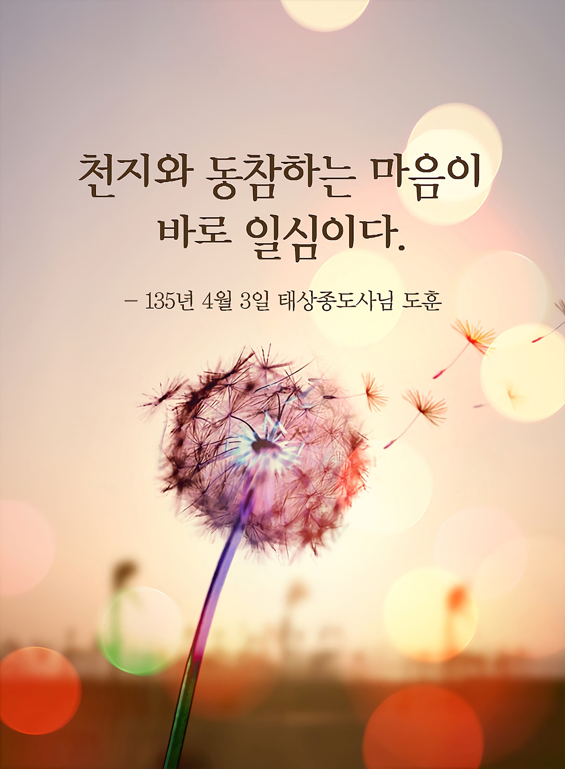 증산 상제님께서는 "천지성경신(天地誠敬信)"이라고 말씀하셨습니다. 천지는 오직 일심으로 한순간도 쉬지 않고 인류를 길러내기 위해 돌아가고 있다는 말씀입니다. 상제님 말씀과 같이 인간이 세상을 바꾸고 역사를 바꾸는 위대한 힘의 원천은 천지와 같은 한마음을 갖는 것입니다.