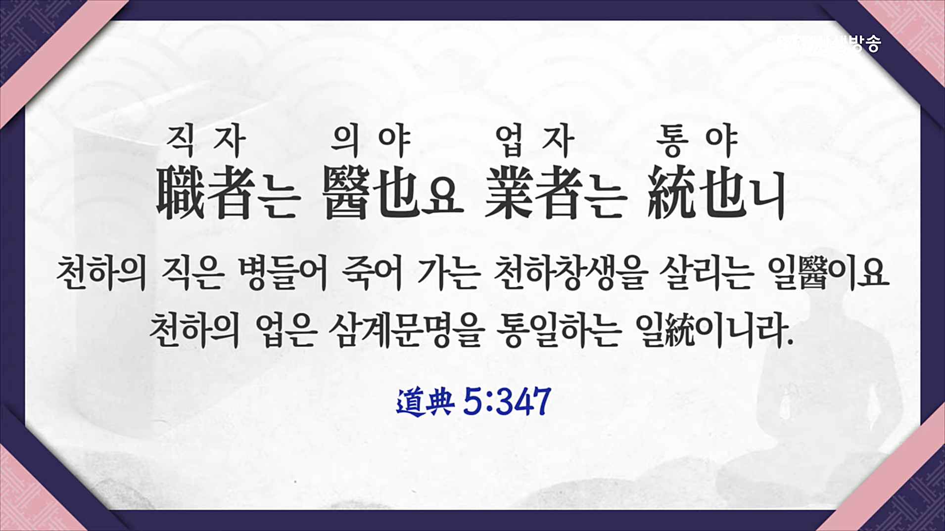 "직자(職者)는 의야(醫也)요 업자(業者)는 통야(統也)니, 성지직(聖之職)이요 성지업(聖之業)이니라." 하나님이 인간 세상에 오셔서 당신님의 직업이 무엇인지 선언하신 말씀이다. 직(職)은 직책이다. 하늘과 땅과 인간과 신명, 온 우주가 다 병들어서 후천개벽 때 넘어가는데, 내가 이것을 살려낸다. 업(業)은 하는 일이다. 상제님이 하시는 일은 통일하는 것이다. 후천개벽기에 온 우주를 살려내는 일이 가장 성스러운 일이다."라고 말씀해주셨습니다.