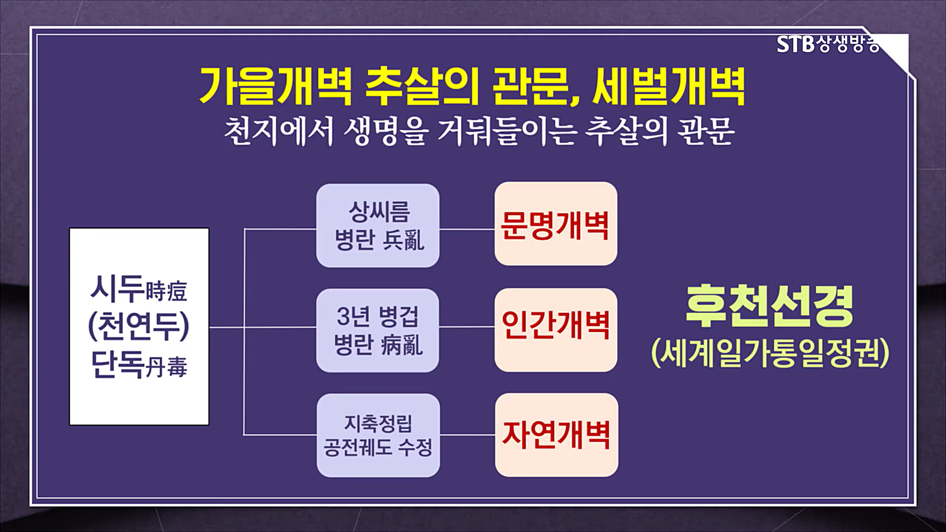 천지 대자연은 봄철에 생생지덕(生生之德)의 한없는 은혜로 만물을 낳지만, 가을에는 '추상(秋霜)'이라는 말처럼 추호도 사정을 두지 않고 서슬이 퍼런 위엄을 드러내며 망설임 없이 봄과 여름의 결과물인 열매를 맺습니다. 지구 1년에서 가을은 초목이 열매를 맺고, 우주 1년에서 인간은 생사가 결정됩니다. 증산도 의통(醫統) 사상은 단순히 기존 사회 체제의 부분적 수정이 아닙니다.
