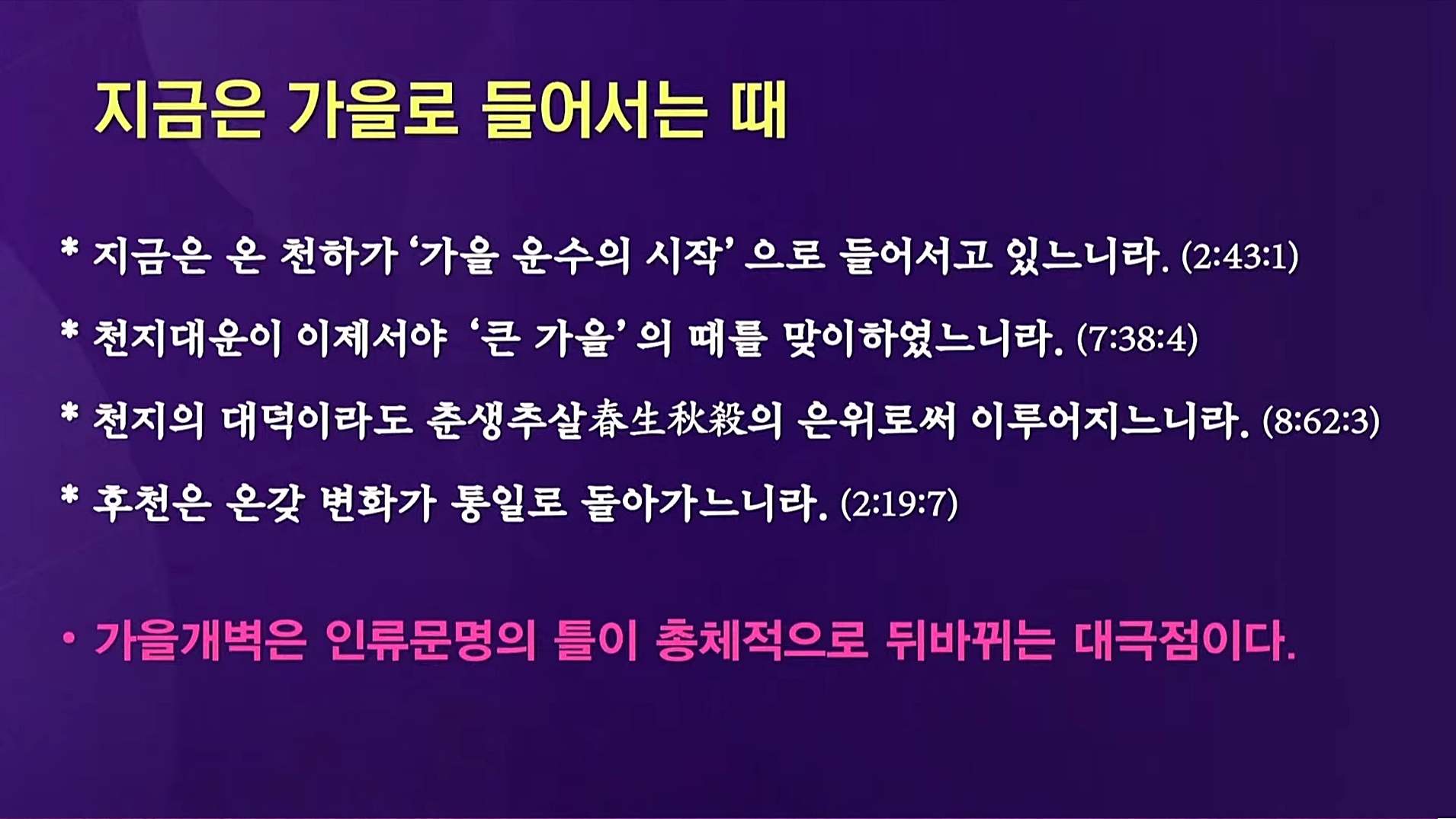 분열과 성장의 질서가 끝나면 통일과 성숙의 질서로 들어가는 것이 천지 대자연의 섭리입니다. 선천 5만 년의 상극 질서가 끝나고 통일과 성숙의 후천 5만 년 상생의 가을우주가 열릴 때는, 지구 1년 사계절의 여름에서 가을로 넘어갈 때처럼 생명을 정지시키는 가을 찬서리가 내리듯 하늘과 땅과 인간 세상에서 대변국이 일어나게 됩니다.