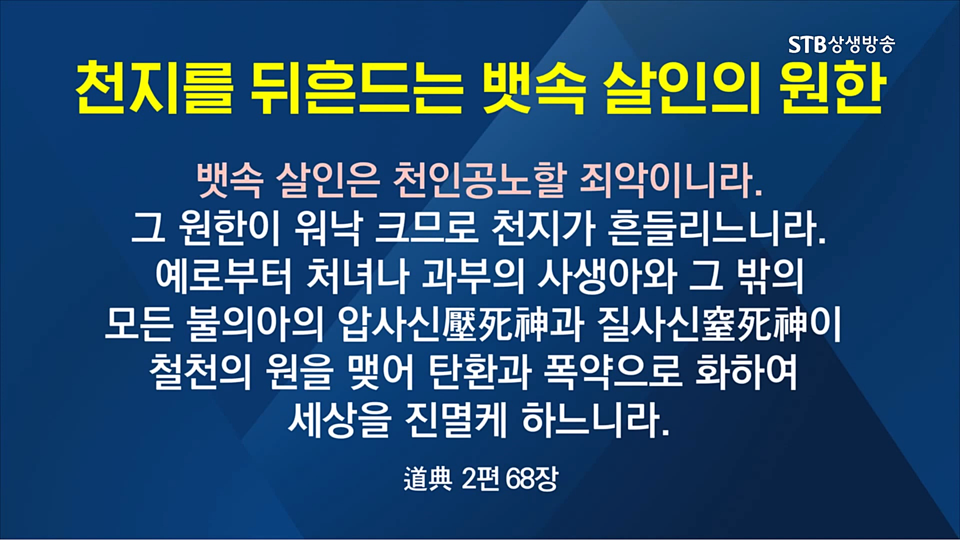 조화와 균형과 제어 작용을 하는 천지 대자연 이법의 상극(相克) 섭리는 인간이 도덕적 가치를 부여할 수 있는 것이 아니며, 선악과 시비가 없는 대우주가 만물을 낳고 기르는 우주 변화의 원리입니다. 그러나 인류 문명사에서 상극 질서는 대립과 경쟁, 투쟁과 반목으로 점철되어 이 세상에 인간으로 왔다 간 모든 사람은 크고 작은 원한(寃恨)을 맺을 수밖에 없는 환경이었습니다.