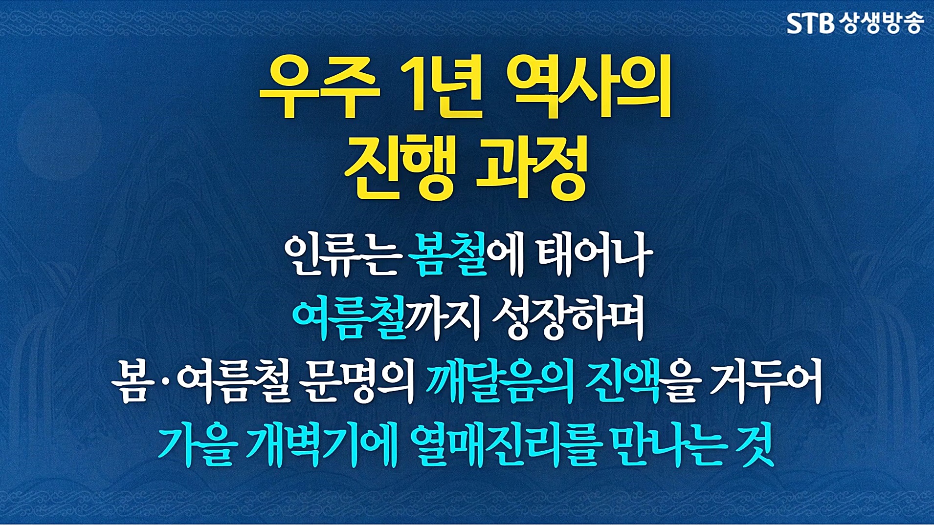 바로 대우주가 사람농사를 짓기 위해 우주의 봄과 여름과 가을과 겨울의 129, 600년을 주기로 돌아가는 우주 1년 시간대가 있다는 사실입니다. 낳고 기르고 거두고 쉬는 생장염장의 질서가 현상계에 드러난 것이 하루의 아침, 점심, 저녁, 밤과 지구 1년의 봄과 여름과 가을과 겨울, 인생의 네 마디와 우주 1년 사계절입니다.