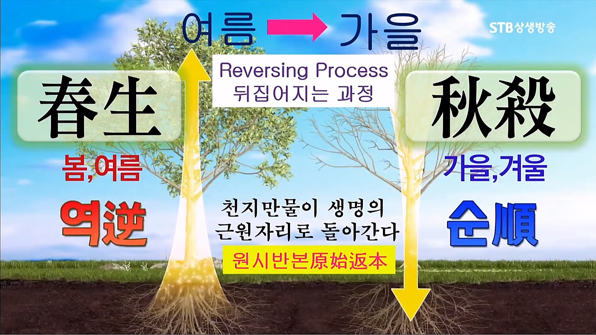 생장염장(生長斂藏)의 질서는 시간의 절대정신으로, 만유 생명은 생장염장으로 돌아가는 천지 대자연의 섭리 안에서 생멸을 거듭합니다. 지금은 우주의 여름철에서 가을철로 들어가는 가을개벽기입니다. 가을의 정신은 시원을 찾아 뿌리로 돌아가는 원시반본입니다. 뿌리에서 올라온 생명의 기운은 가을이 되면 다시 뿌리로 돌아가면서 열매를 맺습니다. 지금은 혈통과 민족과 진리의 근원을 찾아 열매인간으로 거듭 태어나는 유일한 때입니다.