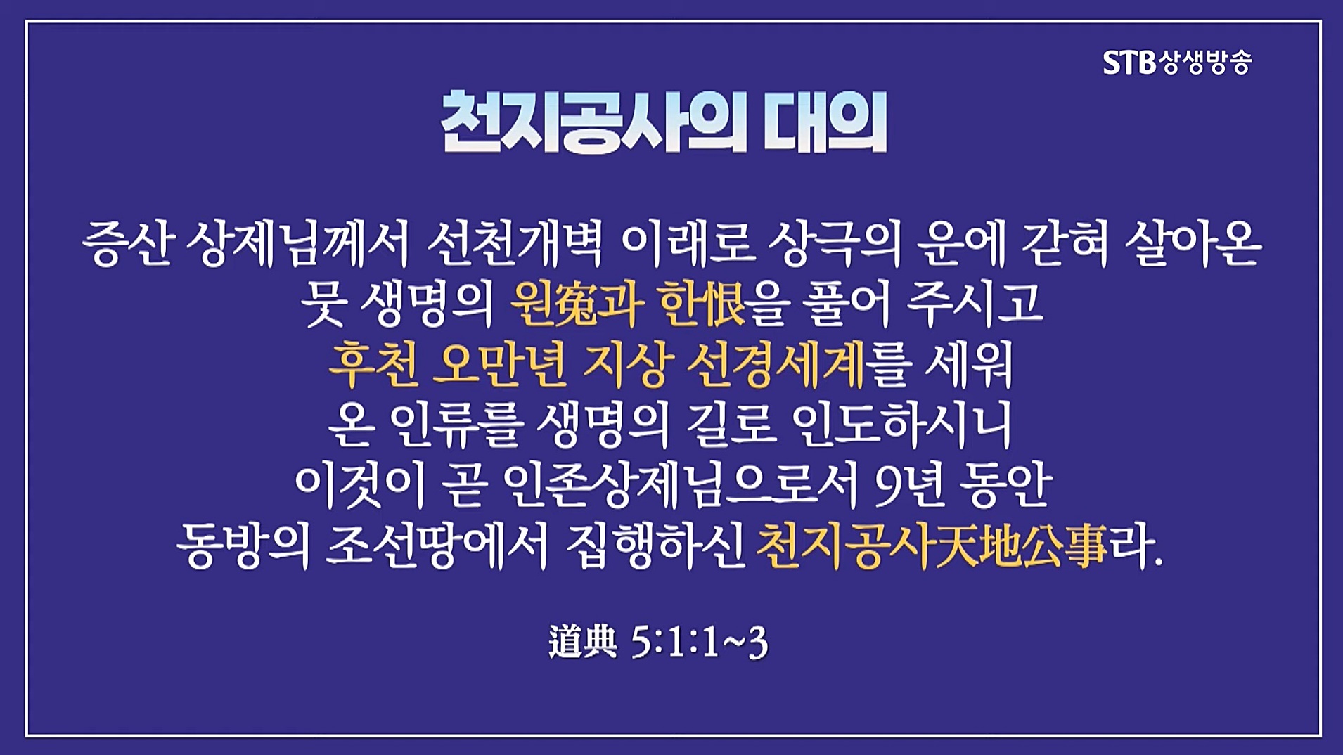 천지인(天地人)은 천지 대자연의 법칙, 즉 우주의 질서에 의해 돌아갑니다. 선천 5만 년은 천지의 질서가 상극으로 돌아갔기 때문에 하늘과 땅과 인간과 신명 세계는 분열과 발전의 상극 질서가 지배했습니다. 후천 5만 년 천지의 질서가 상생으로 돌아가게 하기 위해서 우주 통치자이신 증산 상제님께서 하늘과 땅과 인간과 신명 세계를 개벽하는, 인류 문명을 개벽하는 천지공사를 보셨습니다.