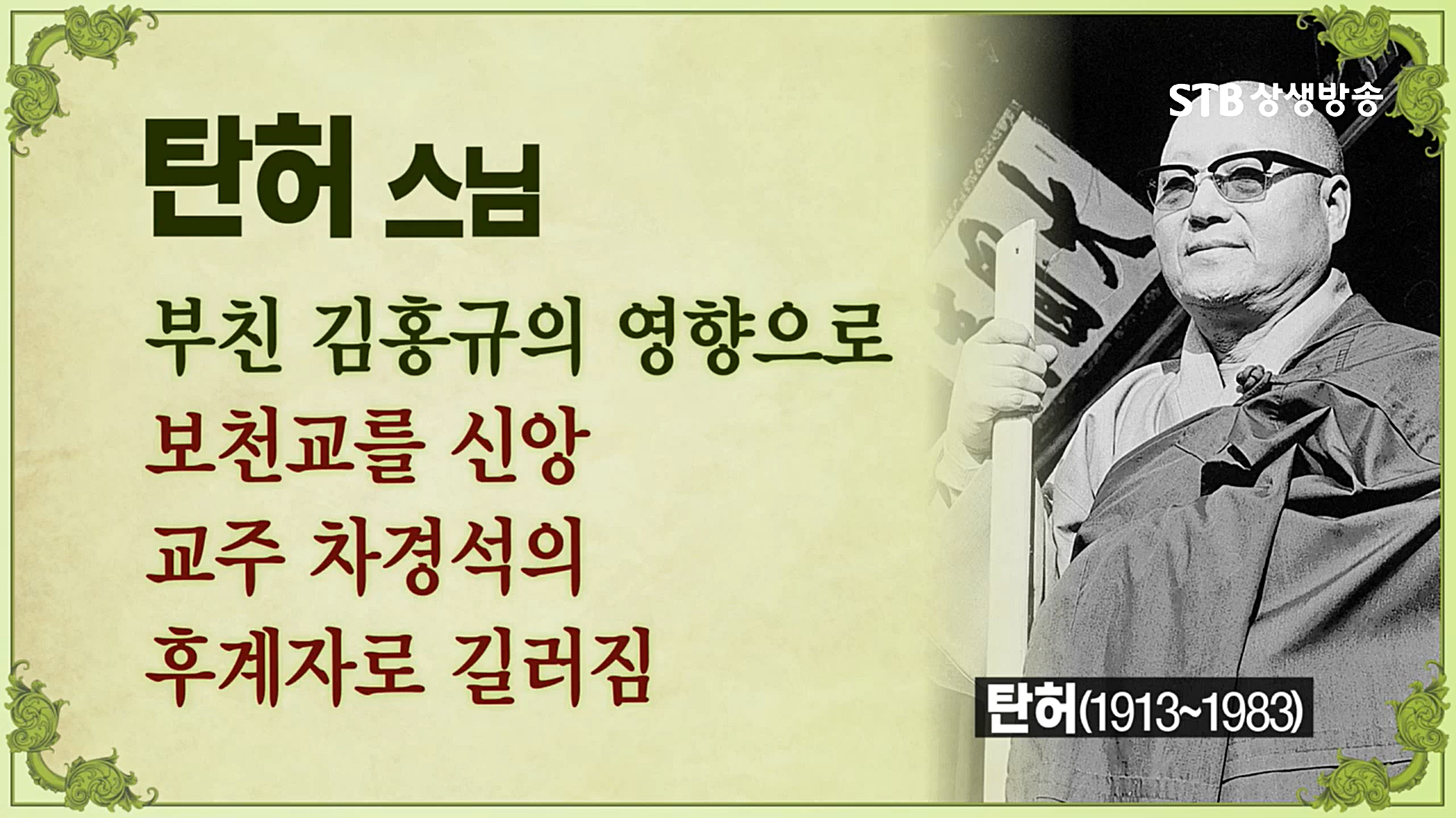 유불선에 회통한 근현대사 최고의 불교 학승으로 알려진 탄허 스님의 아버지 율제 김홍규 선생은 보천교의 목(木) 방주였습니다. 탄허 스님의 아버지 율제 김홍규 선생은 목(木) 방주이면서 조선의 북도(北道)를 관리하는 책임자로, 보천교의 2인자였습니다. 자질이 뛰어난 탄허 스님은 훗날 보천교를 이끌어갈 인재로 양육됩니다.