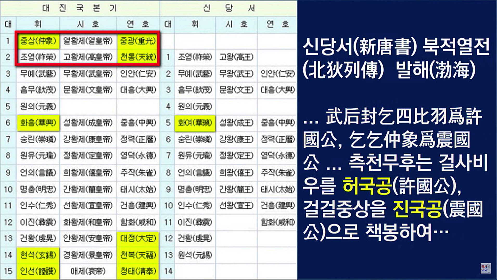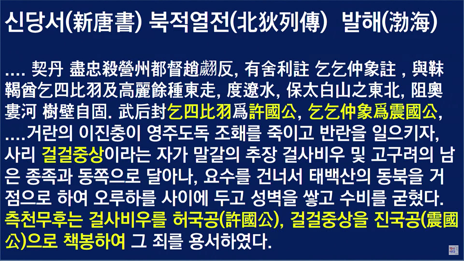 고려 때 이승휴가 지은 <제왕운기帝王韻紀>와 일연의 <삼국유사> 중국의 사료와 우리나라 사료인 <삼국사三國史>와 <신라고기新羅古記>를 인용하여 "대조영이 고구려의 장수였다."라는 사실을 전해주고 있습니다. 중국의 <구당서>와 <신당서> 등의 사료는 대진국을 '발해'와 '말갈' 등으로 폄하했습니다. 한국 주류 역사학계는 우리 역사를 비하한 중국의 기록을 무차별적으로 퍼트리는 더 비열한 집단입니다.