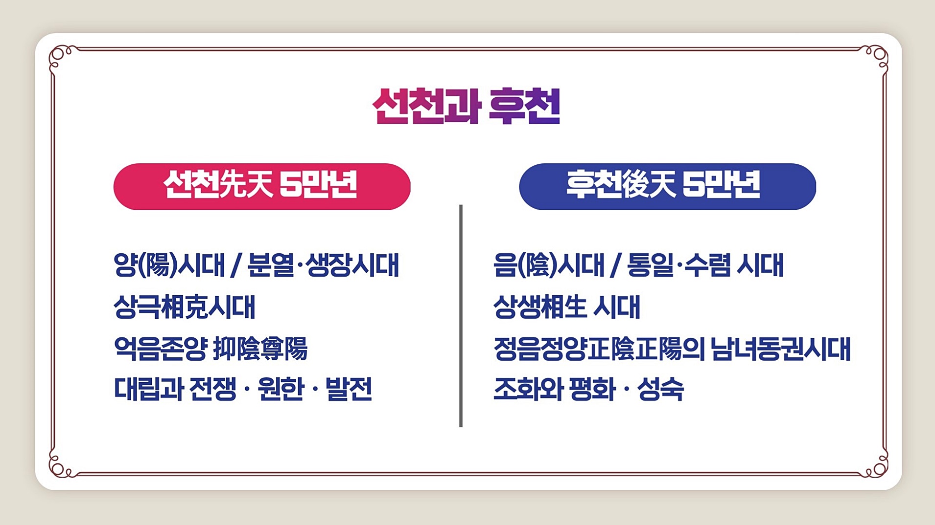 인류의 문명 질서는 우주 질서의 절대적 영향을 받습니다. 다시 말해 우주가 돌아가는 이치가 인류 문명사에 그대로 적용된다는 것입니다. 지나온 역사는 우주의 이치가 상극(相克) 질서로 돌아갔기 때문에 문명의 역사도 대립과 경쟁과 투쟁과 분열의 역사를 거듭하면서 오늘날 최첨단 문명으로 발전해 온 것입니다.