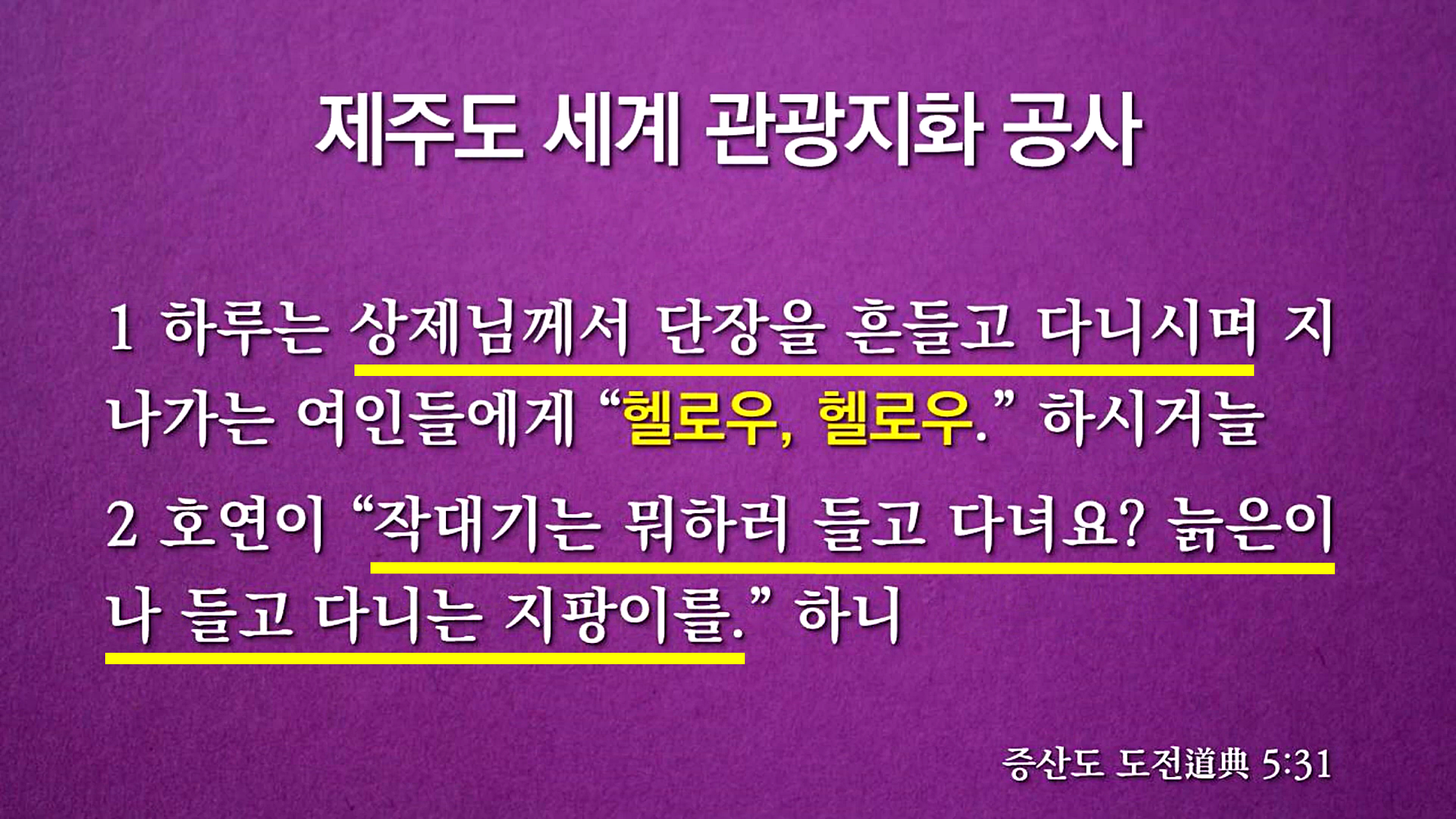 증산 상제님께서 제주도에 가셨을 때 지팡이를 흔들고 다니시며 주민들에게 영어로 말씀하시며 보신 천지공사는 앞으로 제주도에 많은 외국인이 모여드는 세계적인 관광지 국제자유도시가 된다는 것을 보여주신 것입니다. 1994년 제주도 전역이 관광특구로 지정됐고, 1998년 김대중 정부는 제주도 국제자유도시 추진 목표가 정해졌습니다.