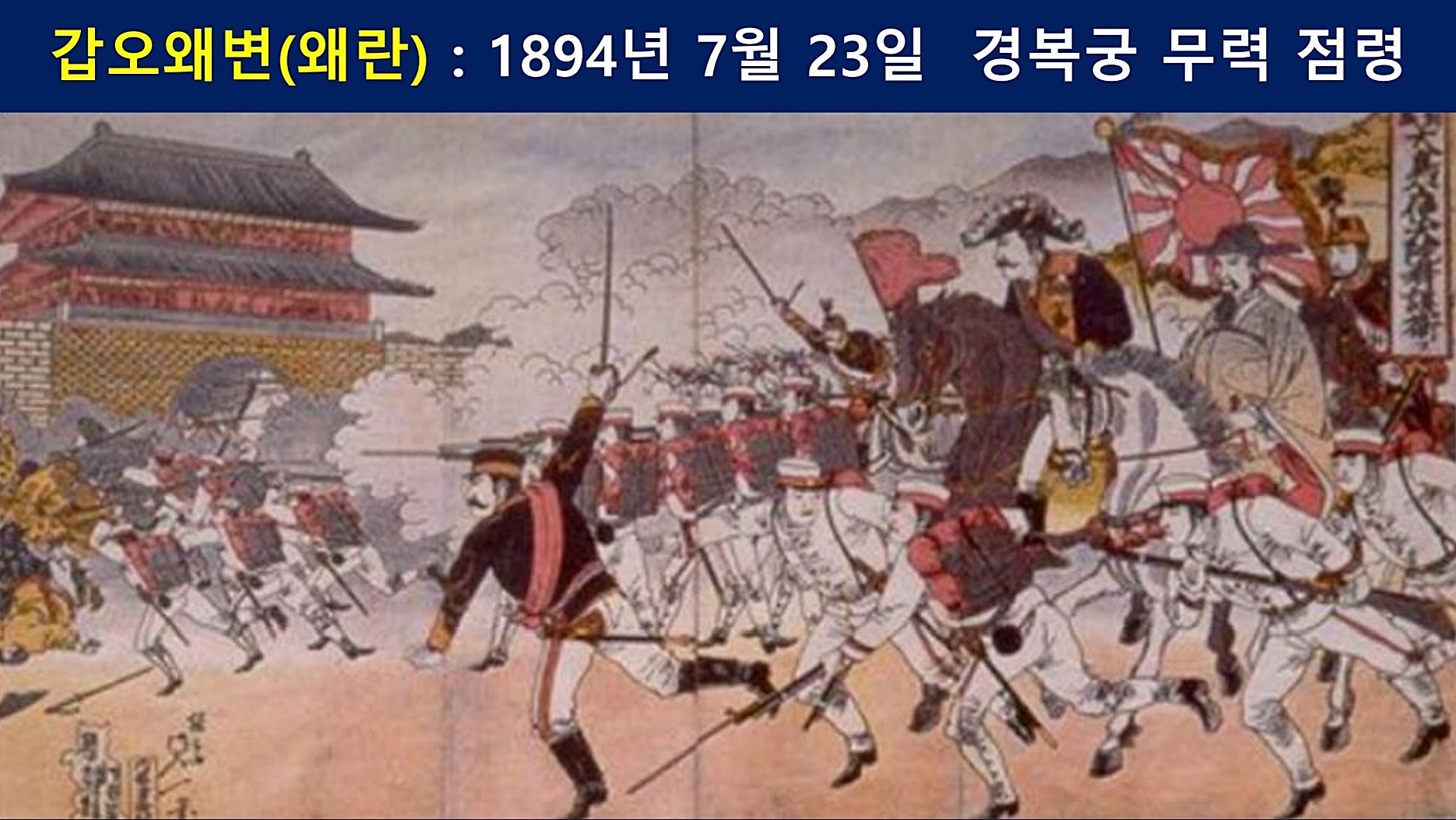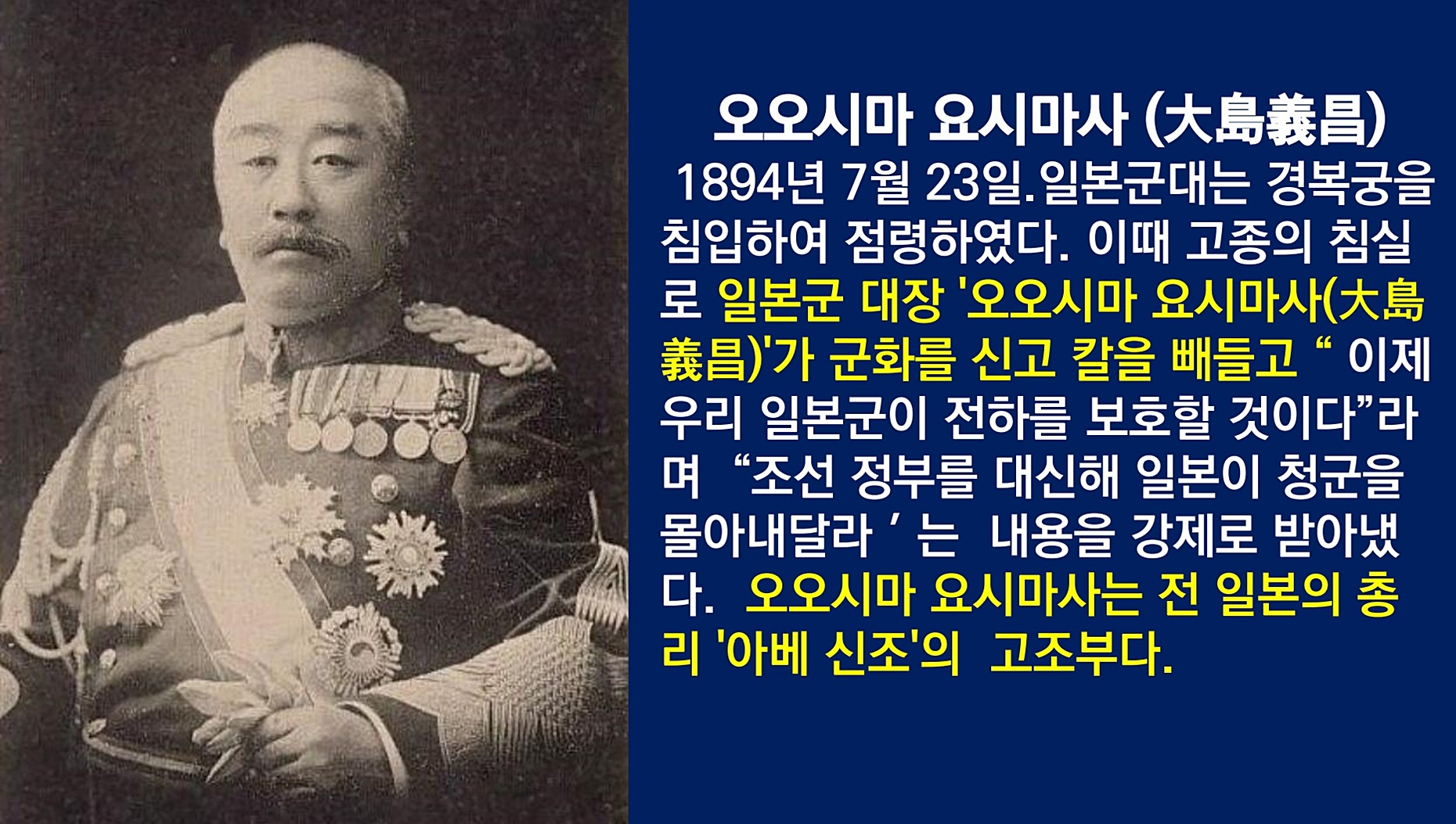 조선에 거주하는 일본인 보호와 천진조약 등의 명분으로 조선에 들어온 일본군은 1894년 7월 23일 조선의 임금이 계신 경복궁을 군홧발로 짓밟고 임금과 왕비를 겁박합니다. 조선의 고종과 중전을 인질로 삼은 일본군 지휘관은 군국주의 부활을 꿈꾼 아베 신조(1954~2022)의 정신적 지주 중 한 명인 외고조할아버지 오시마 요시마사(1850~1926)입니다.