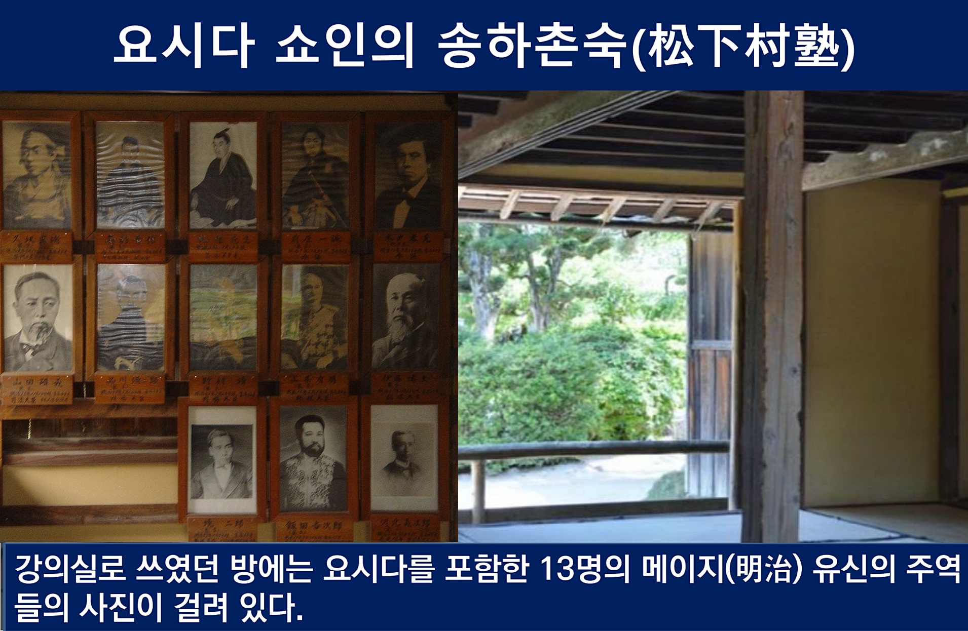 군국주의자인 오시마 요시마사의 정신적 지주는 조슈번 출신 요시다 쇼인입니다. '정한론(征韓論)'을 주창한 요시다 쇼인은 1857년 조슈번에 '송하촌숙(松下村塾)'을 세워 명치유신(1869) 주도 세력과 군국주의의 화신들을 배출했습니다. 민족의 원흉이며 조선 1대 통감 이토 히로부미(1841~1909), 일본 육군의 아버지로 추앙받는 군국주의의 화신이며 2번의 내각총리를 역임한 야마가타 아리토모(1838~1922) 등은 '한국을 정벌하자'라는 요시다 쇼인의 주장을 실현해 나갑니다.