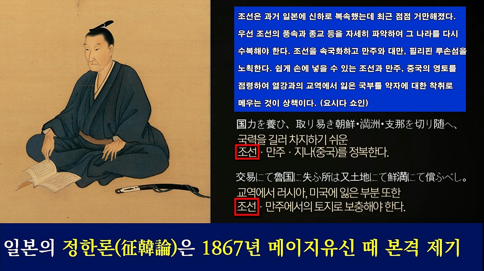 요시다 쇼인이 주창한 '정한론'에 따라 일제 식민사학자들과 일본군과 조선총독부는 한국사를 왜곡하고 조작했습니다. 현재 한국 역사는 일제가 조작한 가짜역사를 진짜역사라고 가르치고 있습니다. 또한 일본 교과서에는 고대 한반도 남부를 야마토 왜(일본)이 지배했다는 내용으로 도배되어 있고, 한국 주류 역사학계 카르텔은 <일본서기> 지명으로 가야 고분군을 유네스코 세계유산으로 등재하기 위해 움직이고 있습니다.