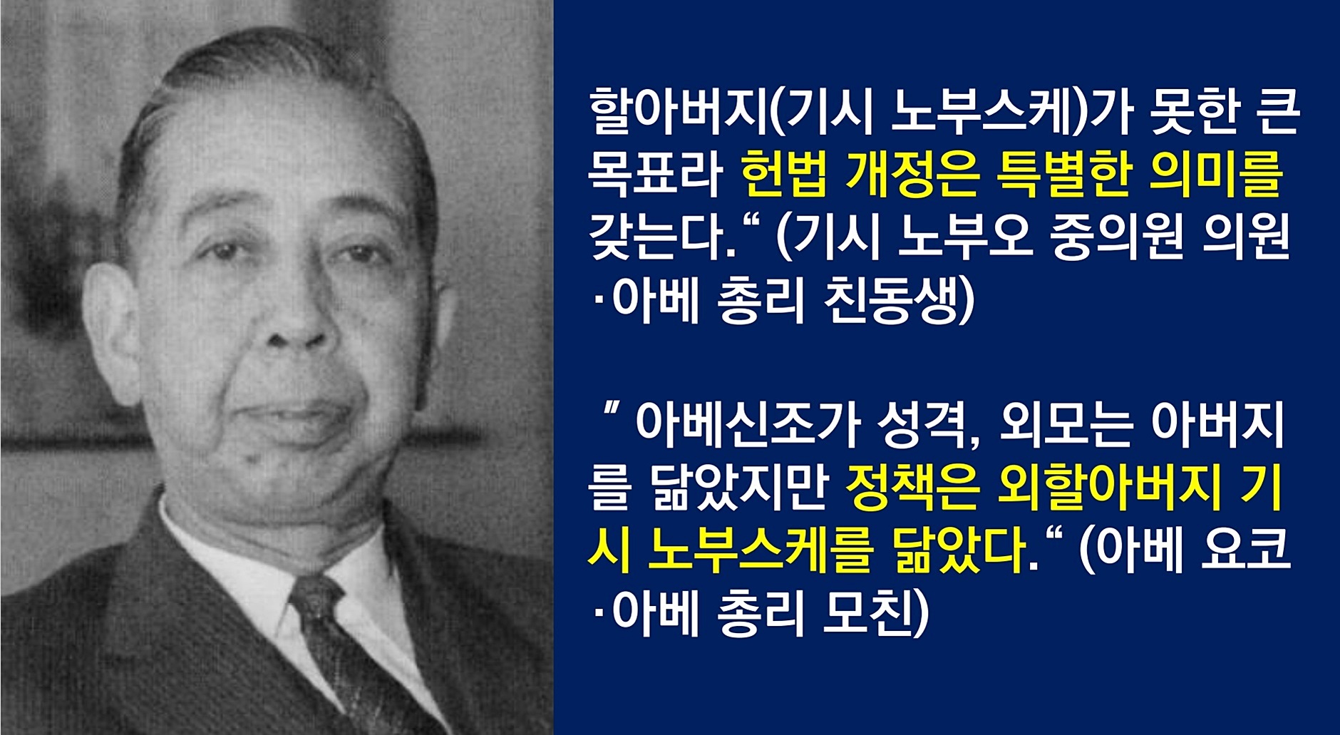 A급 전범이며 일본 제국주의 시대 옛 영화를 되찾기 위해 핵무기 생산을 검토한 기시 노부스케의 손자