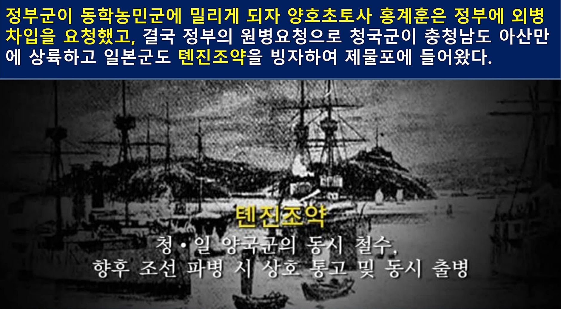 거센 들불처럼 일어난 동학농민혁명은 1894년 6월 6일 조선 정부가 동학농민혁명군의 요구 조건을 받아들이는 '전주화약'으로 평화가 찾아온 듯 했지만, 그전에 조선 정부가 동학농민혁명군 진압을 위해 청나라 군사 파병을 요청해 놓은 문제 때문에 큰 화를 자초합니다. 1894년 6월 8일 청나라 군사 3,000명이 아산에 도착했고, 청나라 군대 파병 첩보를 입수한 일본군은 6월 하순까지 8,000명을 조선에 투입합니다.