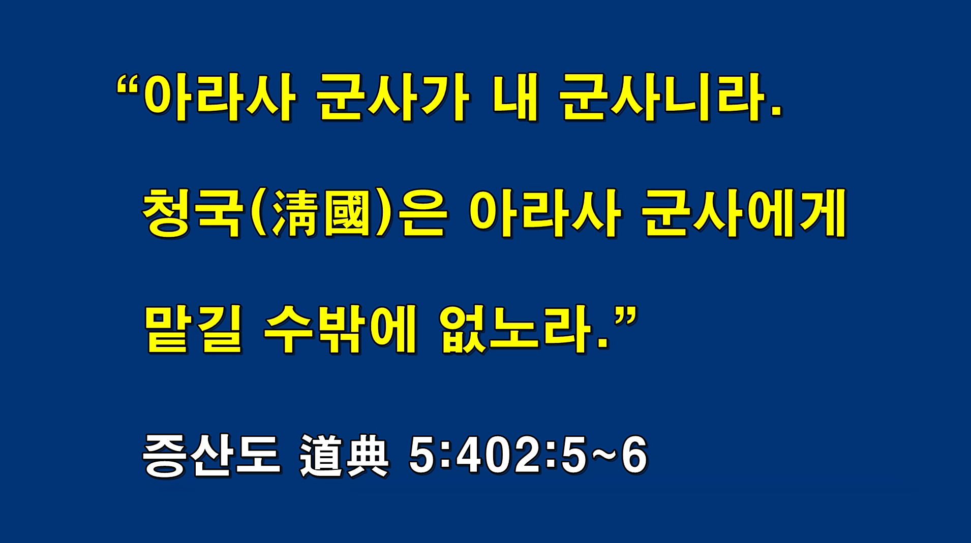 중화민국 장개석의 군대와 공산당의 내전에서 승리한 모택동은 1949년 사회주의 국가 중화인민공화국을 수립합니다. 1909(기유)년 증산 상제님께서 "청국(淸國)은 아라사 군사에게 맡길 수밖에 없노라."라고 말씀하시며 당시의 청나라(1616~1912)가 사회주의 국가로 전환하는 데 아라사(구소련)의 지원으로 천지공사가 이루어진다는 말씀입니다. 볼셰비키 혁명과 코민테른의 영향으로 중국 공산당이 창당되고, 코민테른이 자금과 무기를 지원해 세워진 황포군관학교에서 국민당 군대와 공산당 군대 지도자들이 배출됐고, 두 차례의 국공내전과 대장정을 거쳐 중화인민공화국이 수립됐습니다.